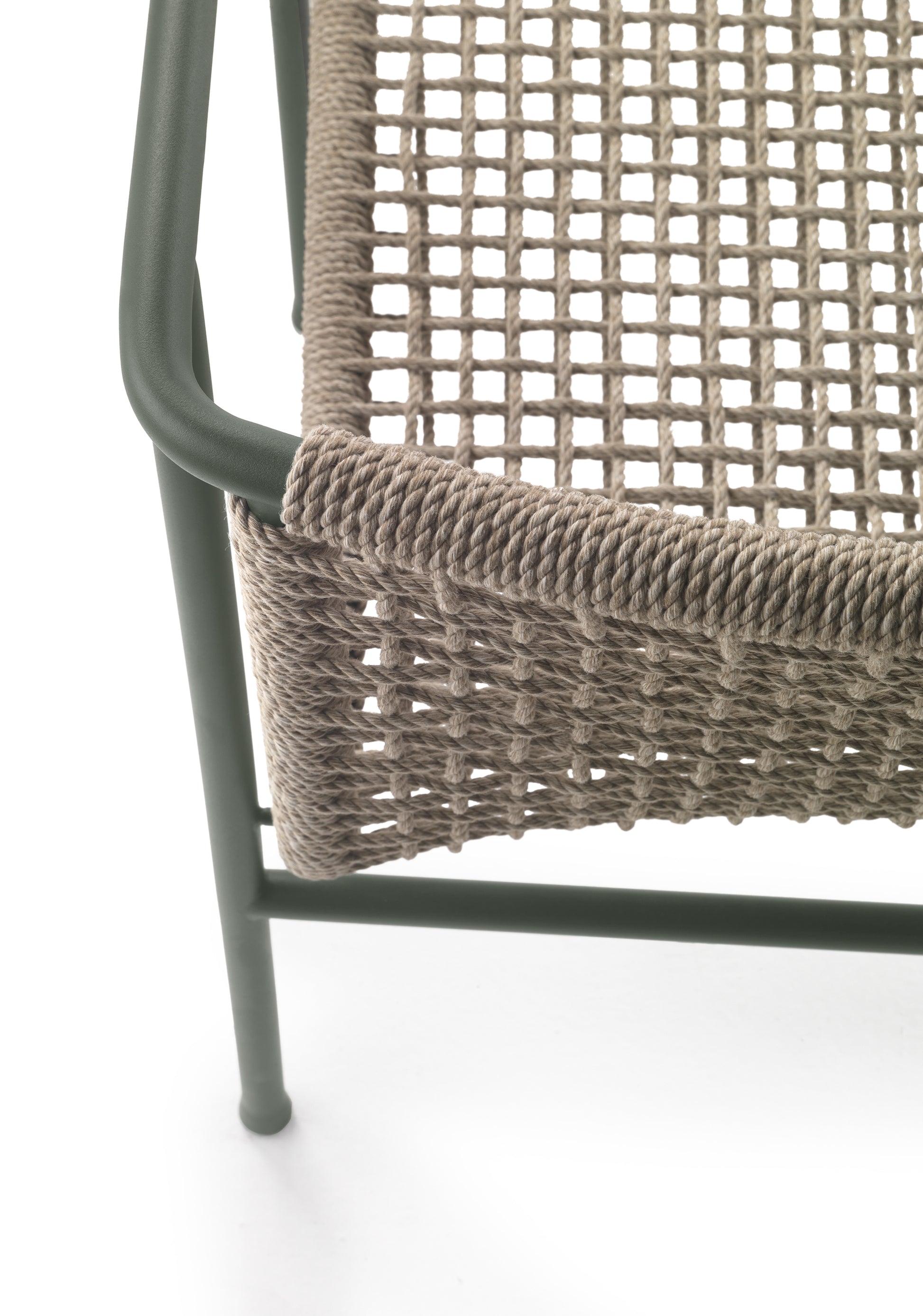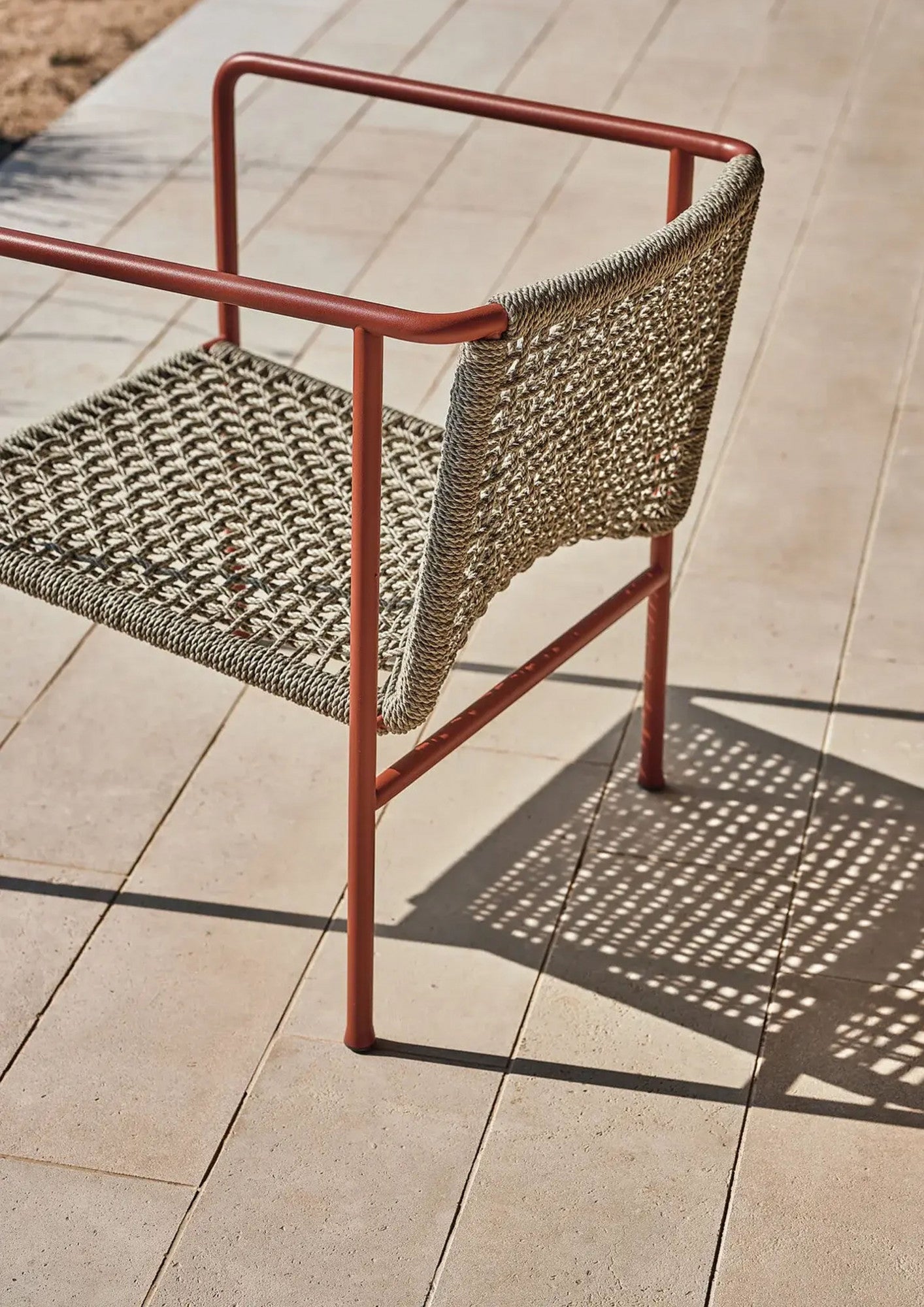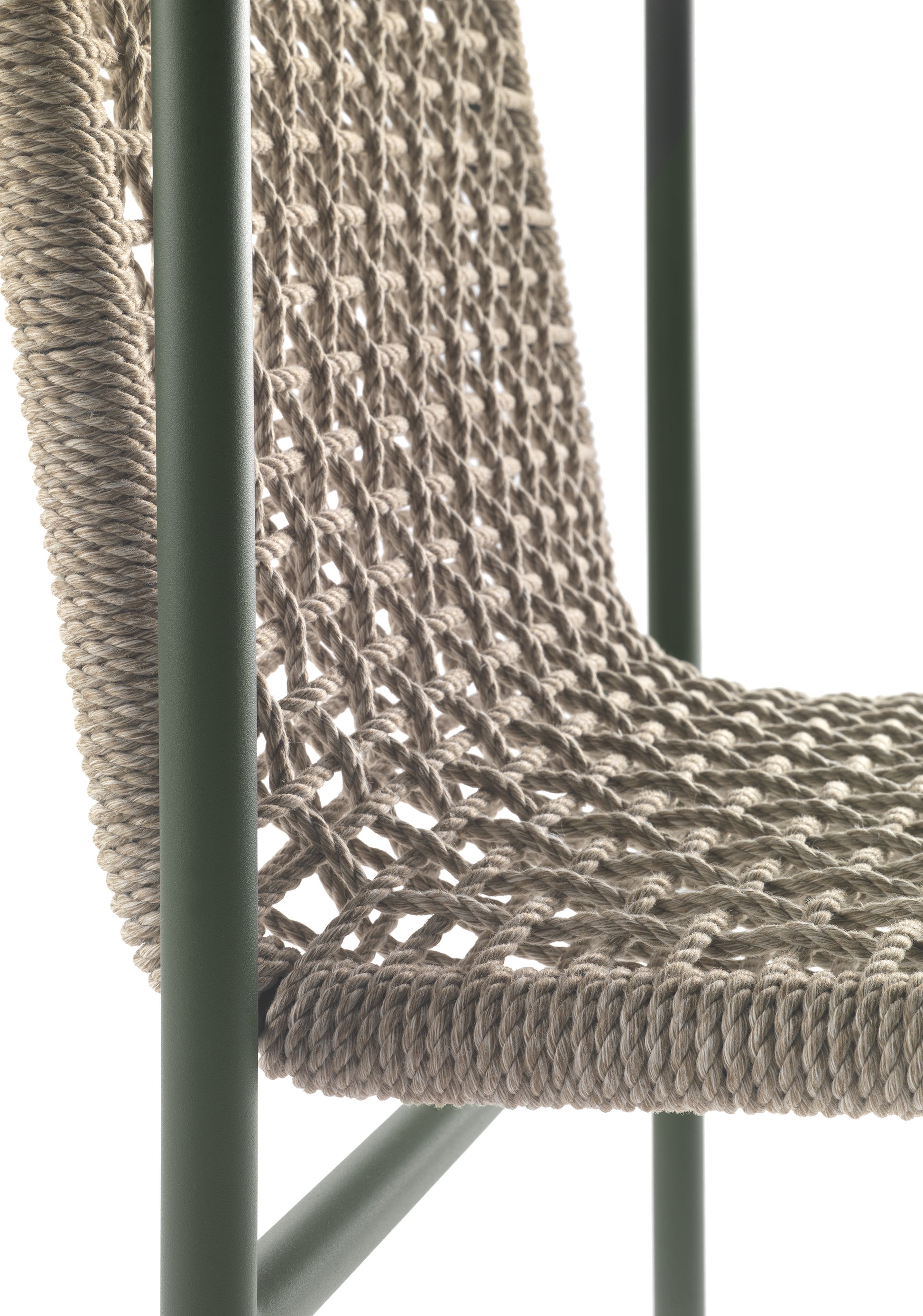 The combination of a sleek metal structure and light yet sturdy woven cord defines the personality of the Ottavia seating elements.