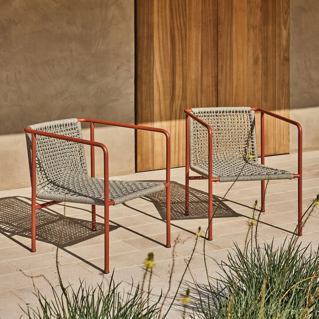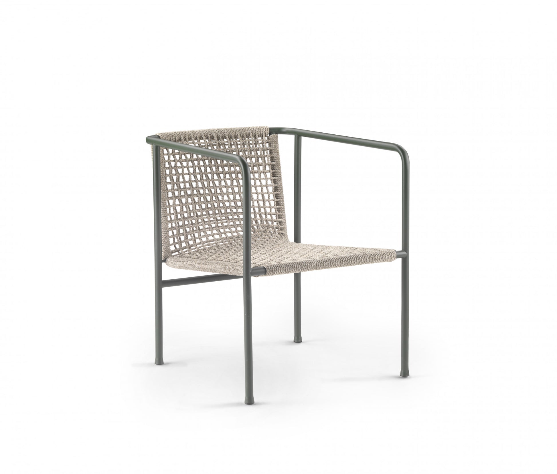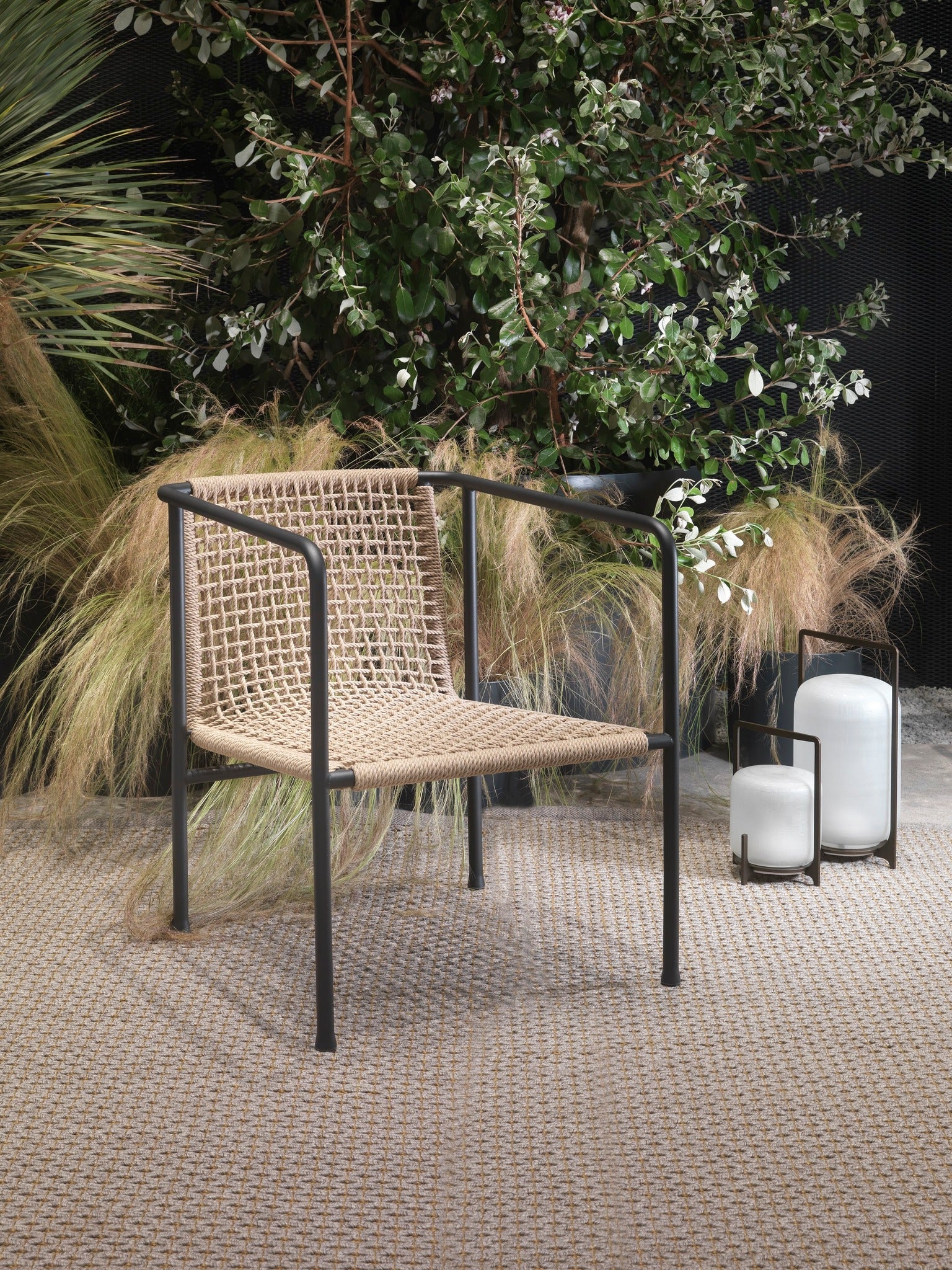The combination of a sleek metal structure and light yet sturdy woven cord defines the personality of the Ottavia seating elements.