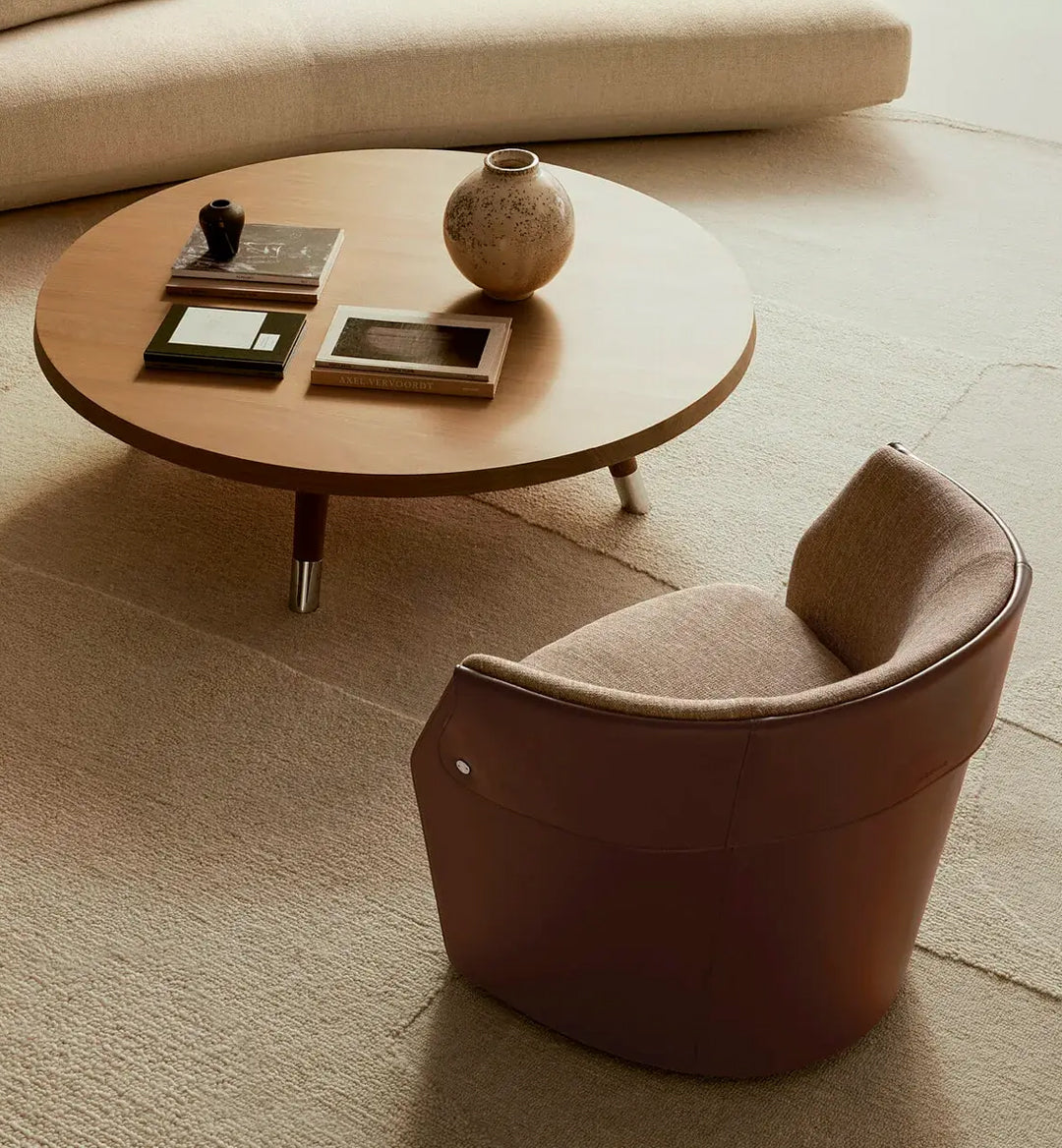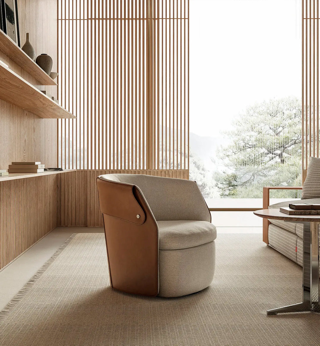 Distinctive feature of the Ozzy armchair, as with the eponymous ottoman and dining chair, is the cowhide-clad outer backrest that can be paired, in an array of elegant combinations, with the seat upholstery, available in leather and fabric. Supported on a metal swivel base, the armchair welcomes soft goose-down cushions that lend elegance and exceptional comfort to the seat.