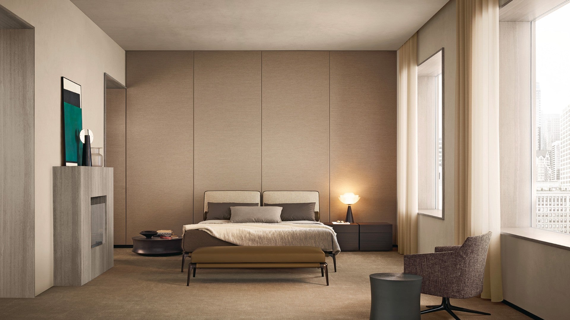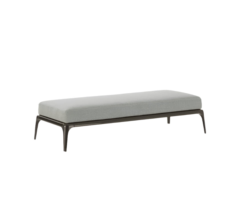 The Park bench is an accessory designed to pair with the bed of the same name, echoing the same lightweight and contemporary lines. The metal frame, also available in an upholstered version, supports a soft cushion in fabric or leather to match the bed finishings.
