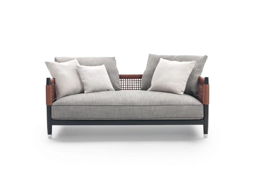 The structure of the Parker sofa is made of solid turned and hand-finished wood. The finely woven material featured on the backrest and armrests is also entirely hand-made. It has a single seat cushion and large, generously padded loose cushions that lean against the backrest, which comes in versions clad in woven cord or in cowhide.