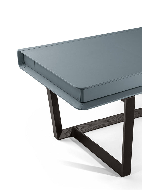 The Peek-a-Book large desk consists of an extremely simple sheet of poplar plywood covered in Pelle Frau® leather which is curved and folded in two to form the base and the desktop, as well as to accommodate two drawers. The base structure consists of an easel made from triangular-section solid ash in a moka or wenge stain which forms three trapezium-shaped supports connected to each other with fine joints created in the wood. The front of the two drawers is in MDF covered in Pelle Frau® leather matching the upholstery of the top, while the internal structure is made from solid ash in a wenge stain.