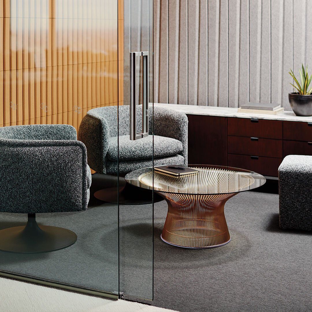 Originally introduced by Knoll in 1966, the Platner Collection is an icon of modern furniture. Platner personally formulated the production techniques for the complicated designs with each chair requiring over a thousand welds and more than one hundred cylindrical steel rods. Knoll also introduced an executive private office collection designed by Platner.