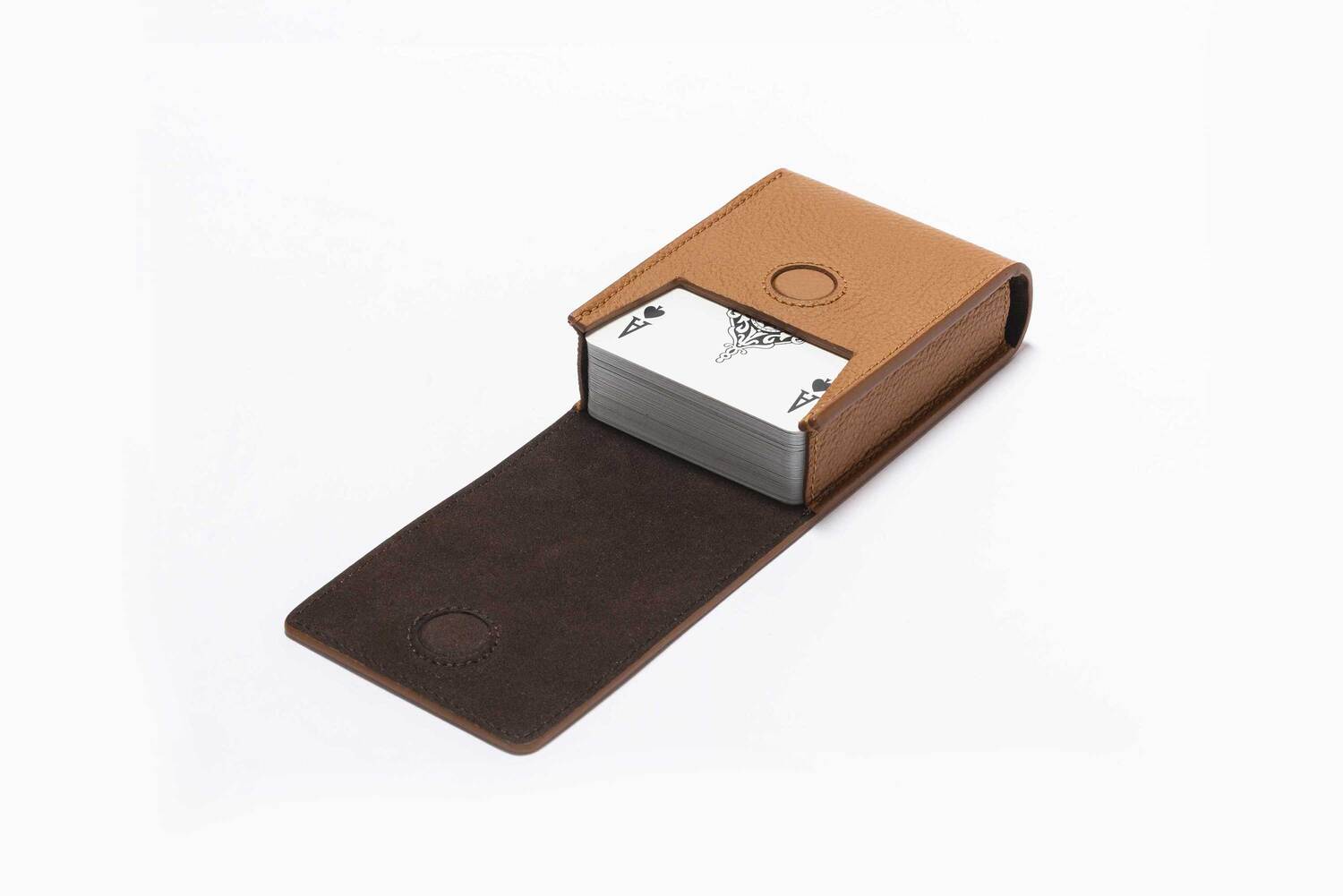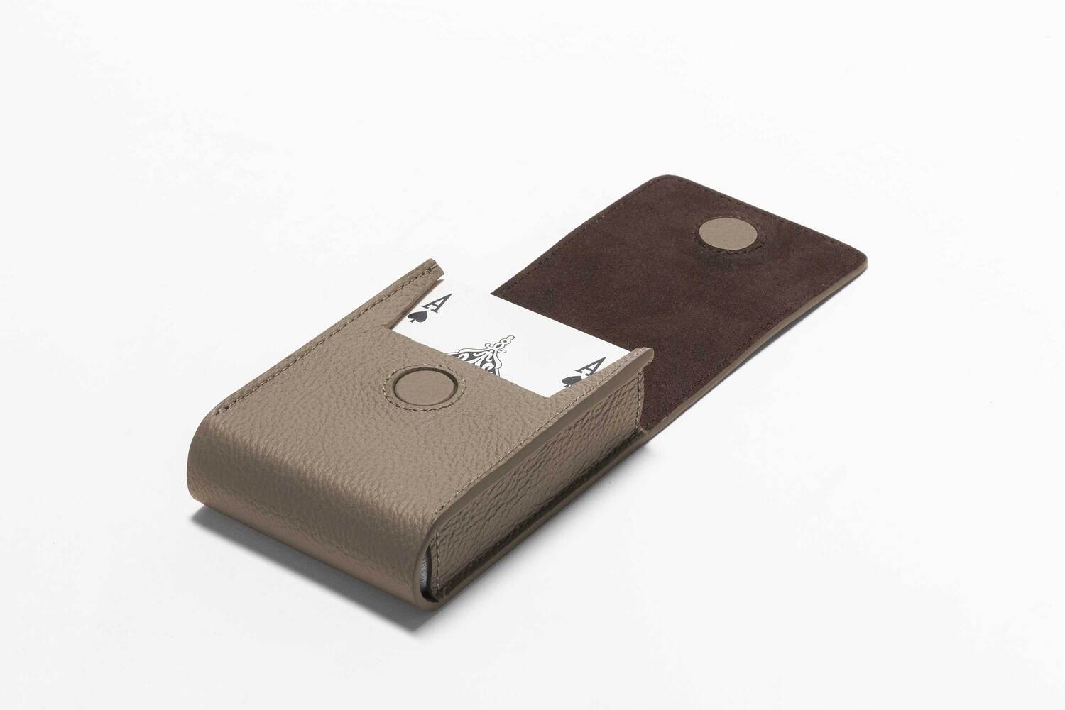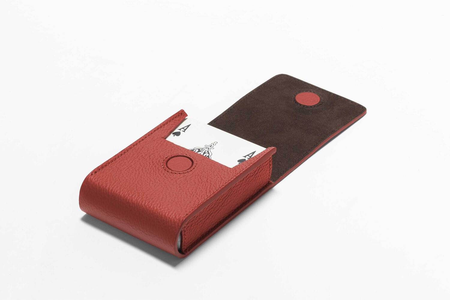 The card leather pochette is an elegant and essential accessory for storing collectible decks of cards. The card leather pochette is made of Pelle Frau® leather with an inner lining and magnetic closure, and holds a precious deck of Giobagnara playing cards inside.