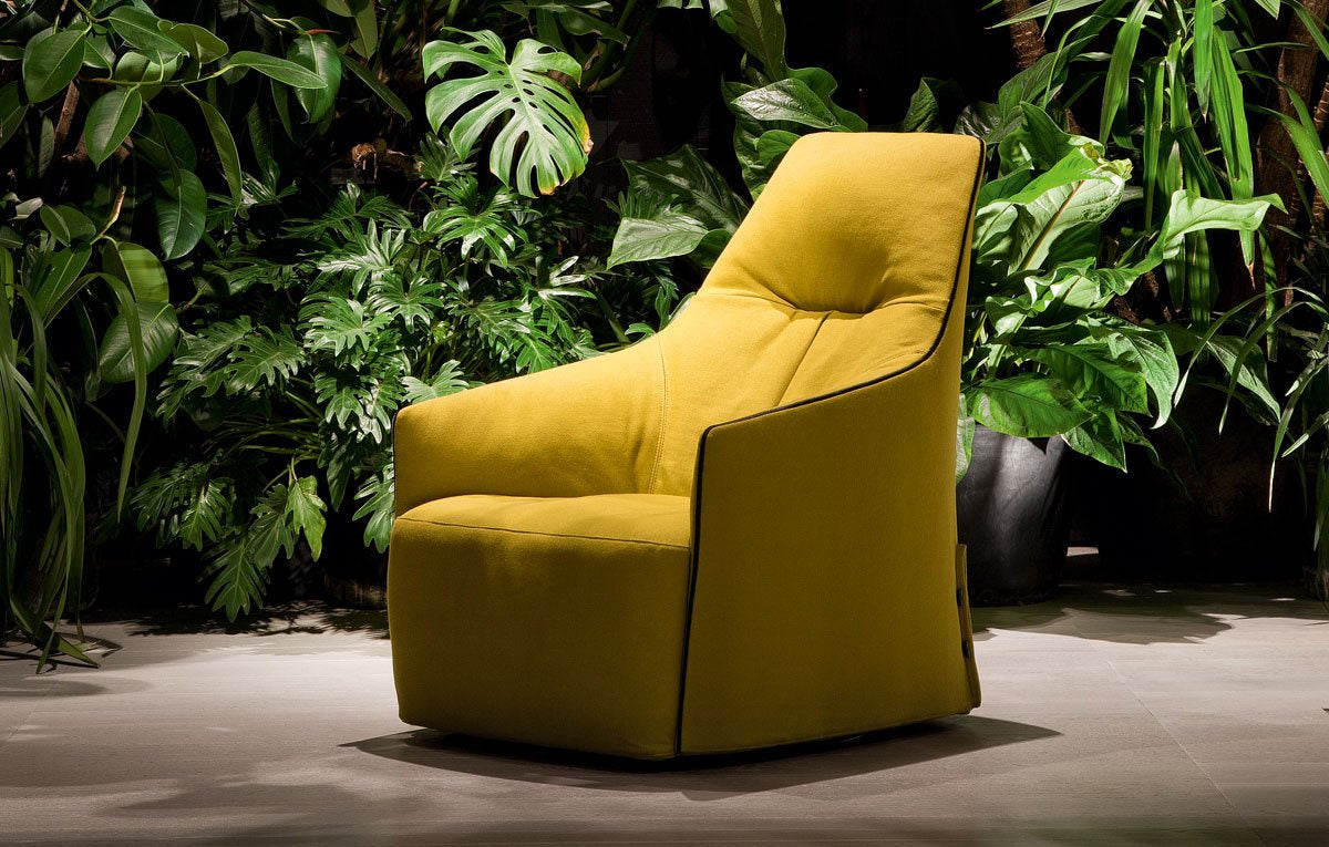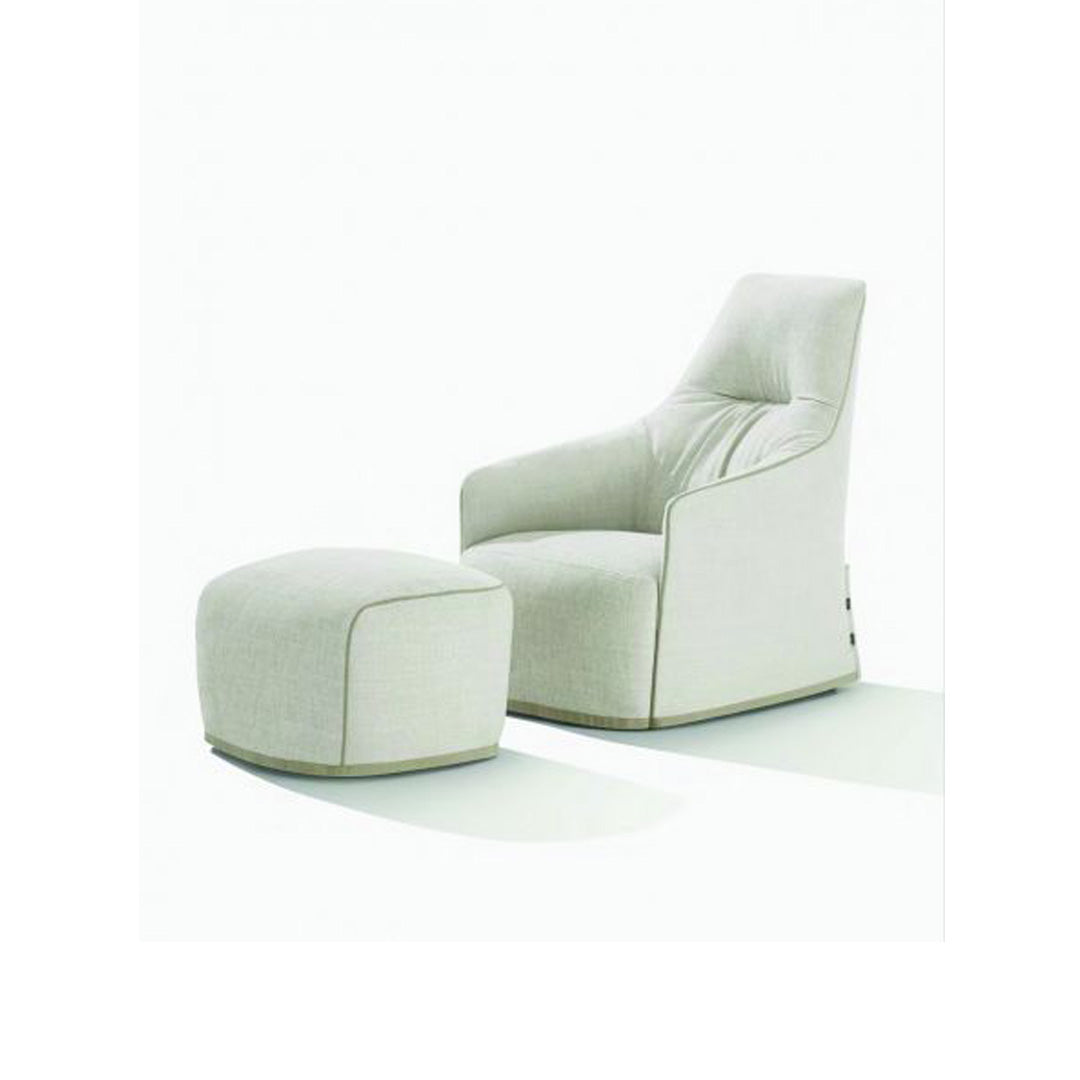 The elegance of the Santa Monica collection is also reflected in the Lounge version of the armchair, with a high back and coordinated pouffe. Upholstered in fabric or leather, it is enriched by sartorial details such as the folded back with frog fastenings, the cord stitching and the grosgrain edging.