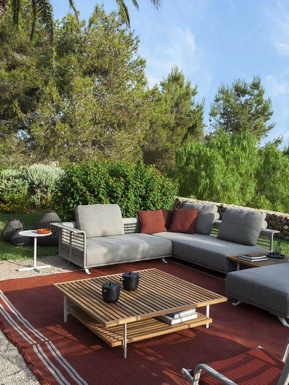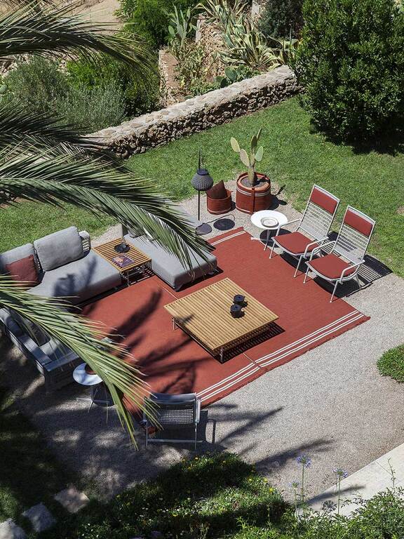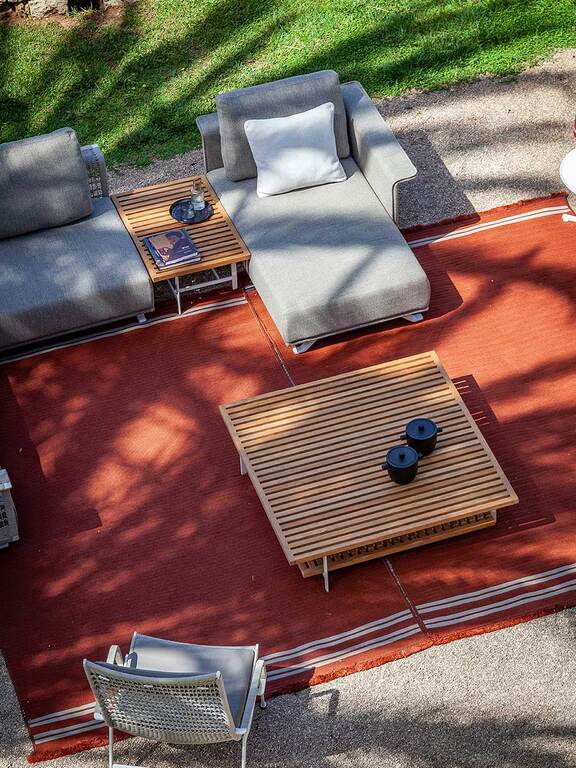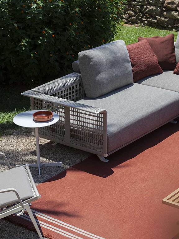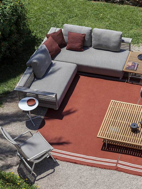 The double-sided Sherazade outdoor rugs designed by Simona Cremascoli evoke a sense of wholesomeness and atmosphere. Matching the outdoor baskets of the same name, the rugs are made of polypropylene braid stitched together and have clearly visible stitching points that become an aesthetic motif. They are finished on the short side with fringes reminiscent of products for indoors. In hard-wearing, weather-resistant outdoor fabrics, they are available in three colours, ecru, blue and rust, to complete the outdoor spaces of terraces, rooftops, verandas or decks of yachts and ships, without compromising on practicality. They are part of the outdoor furniture line by Poltrona Frau Boundless Living Outdoor Collections.