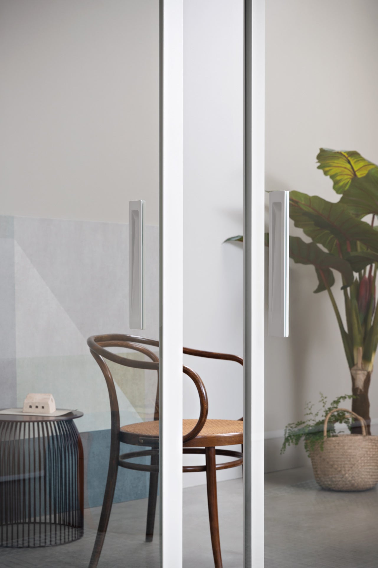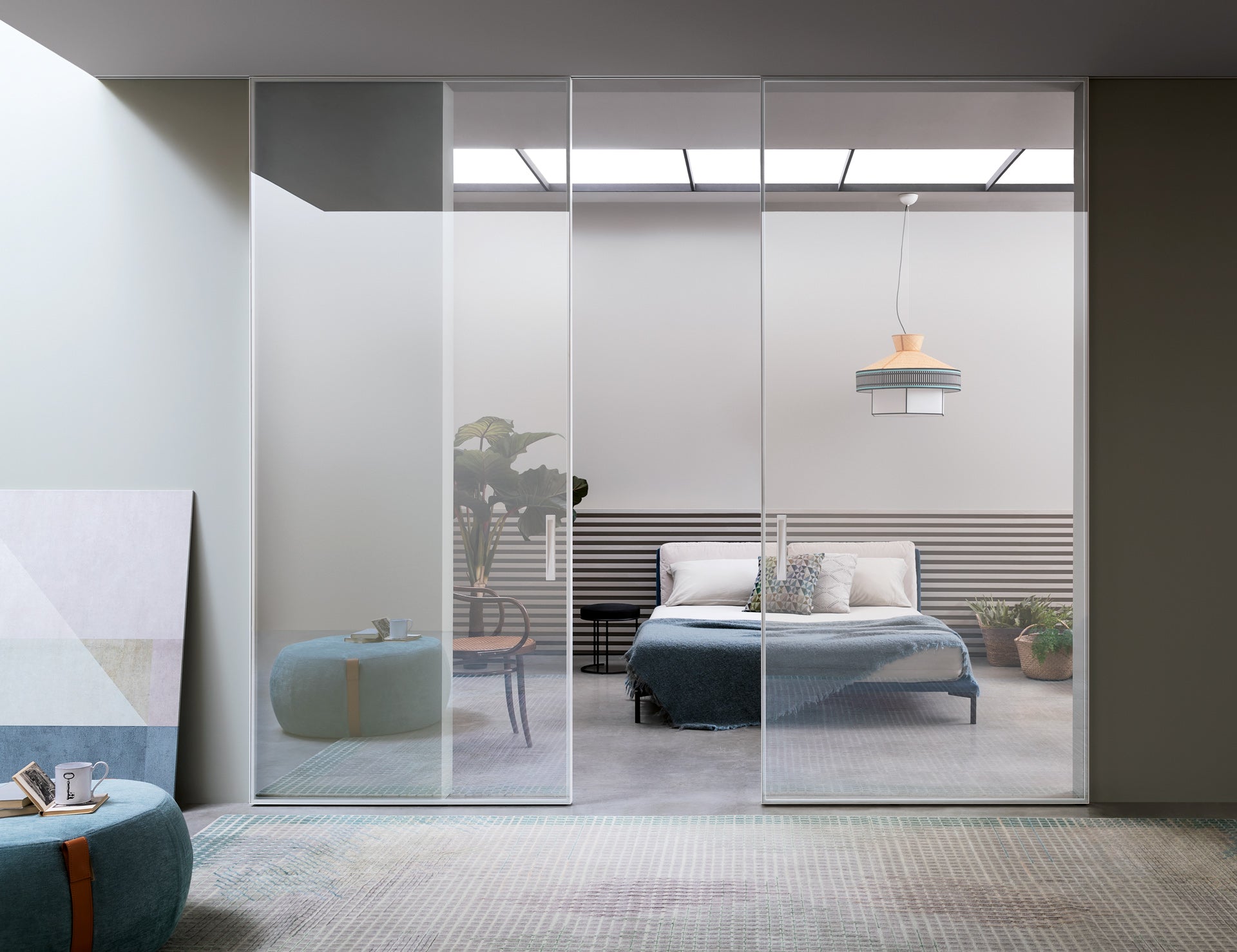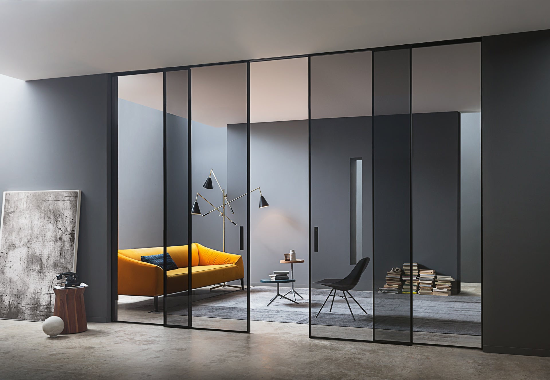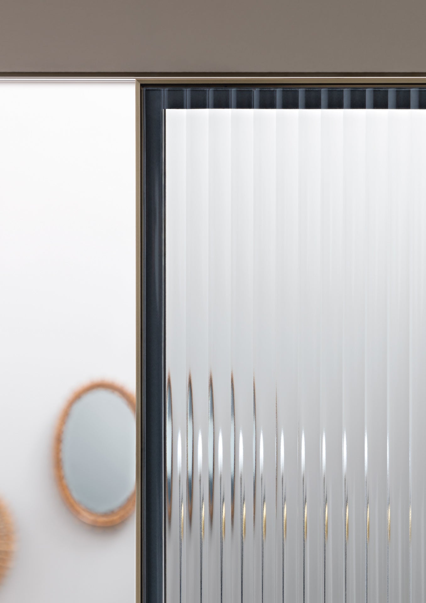 Inspired by the traditional Japanese house’ slender and extensive mobile surfaces, Shoin is a system of sliding doors and fixed glass panels with one or two rails, designed to create walls. The panels are fixed within a slim aluminum frame, flush with the external side of the composition.