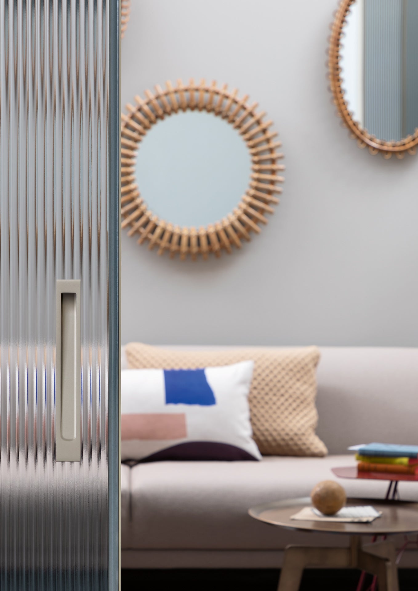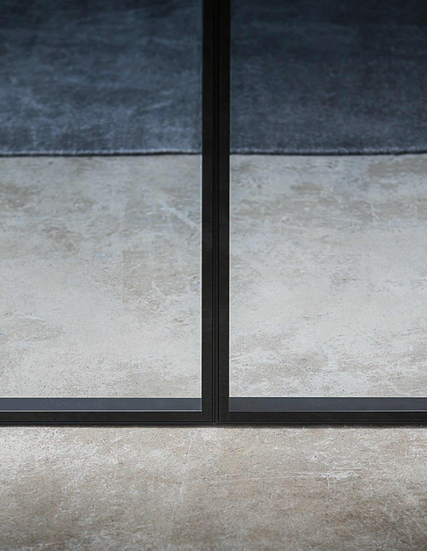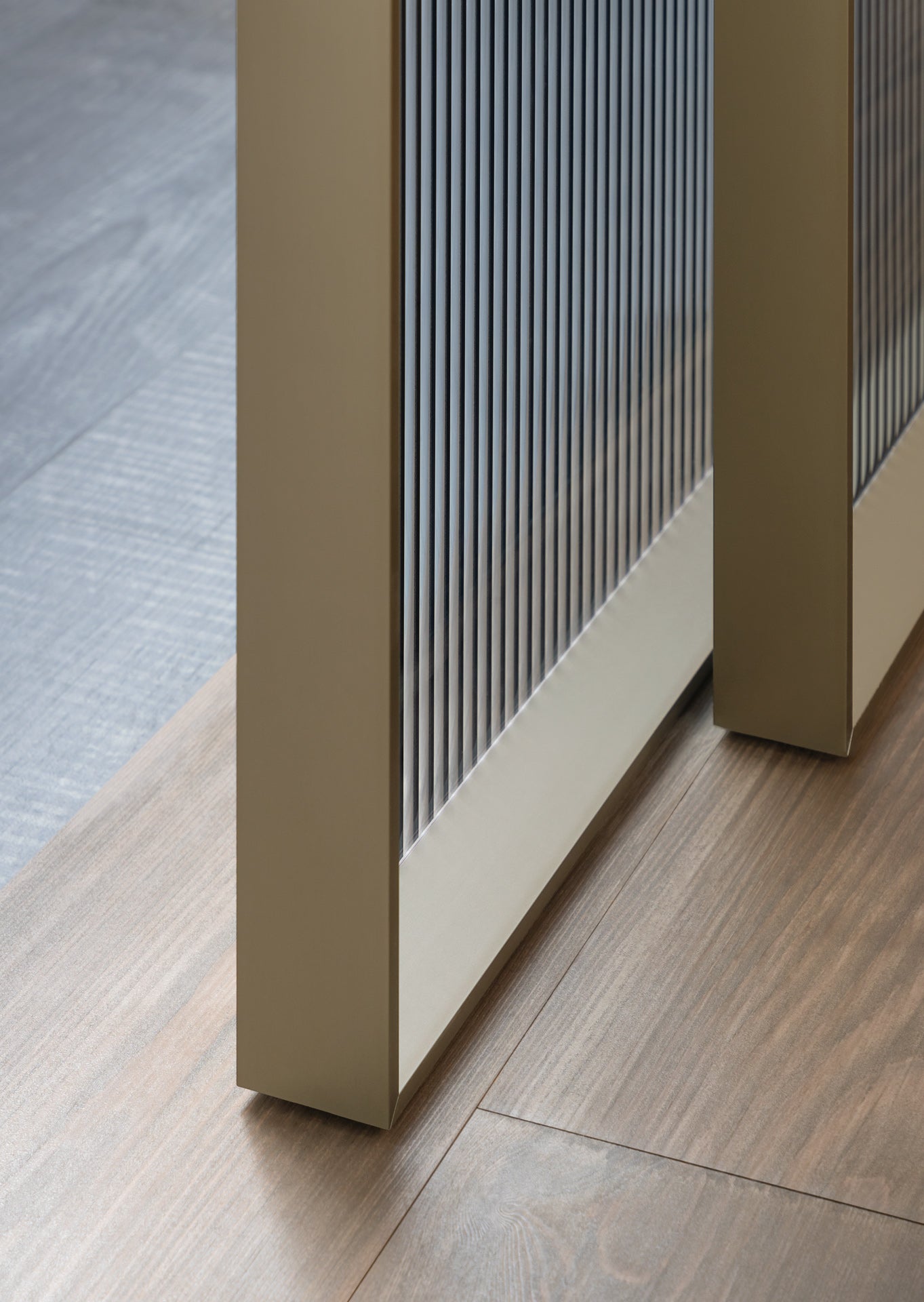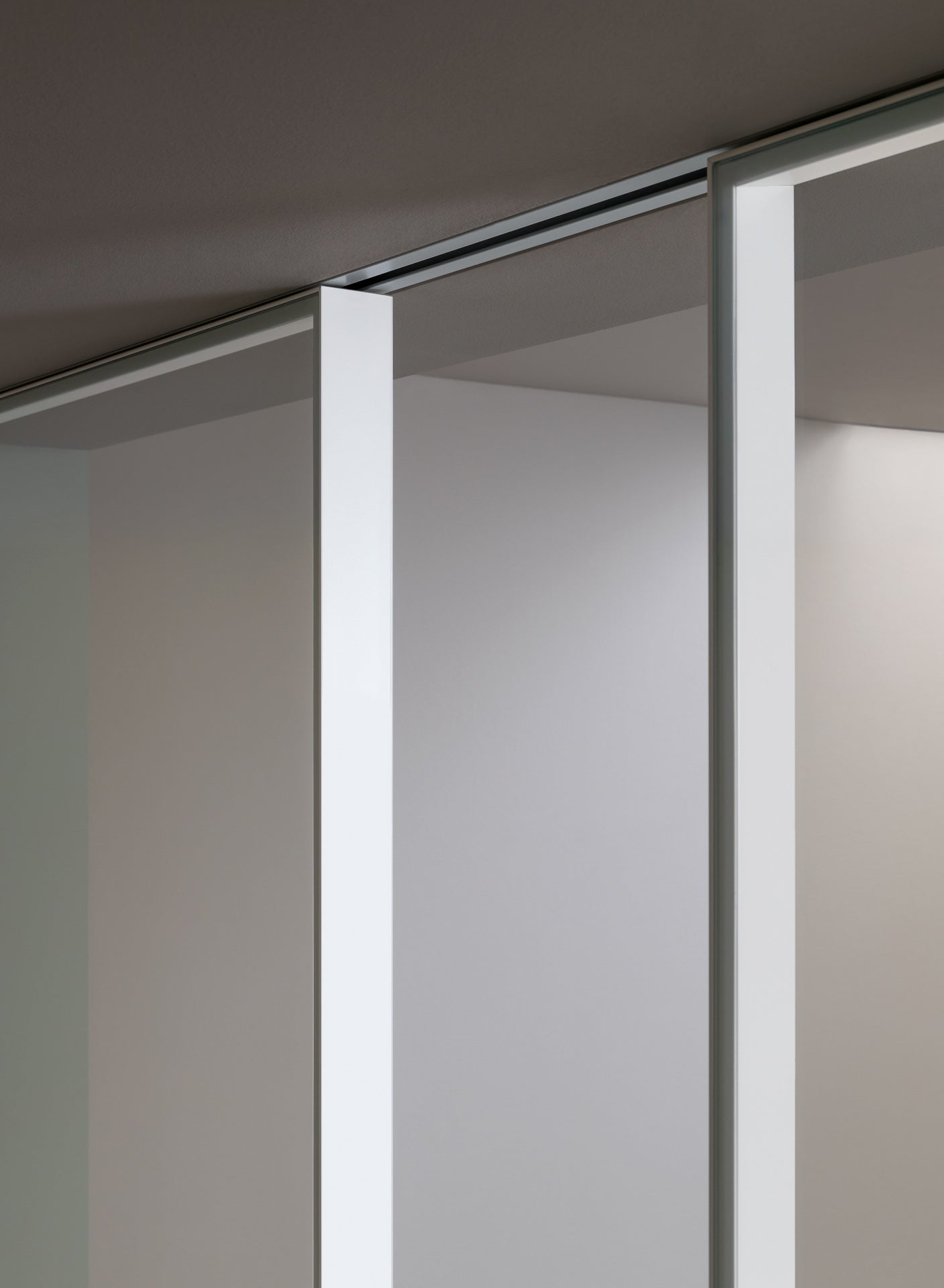 Inspired by the traditional Japanese house’ slender and extensive mobile surfaces, Shoin is a system of sliding doors and fixed glass panels with one or two rails, designed to create walls. The panels are fixed within a slim aluminum frame, flush with the external side of the composition.