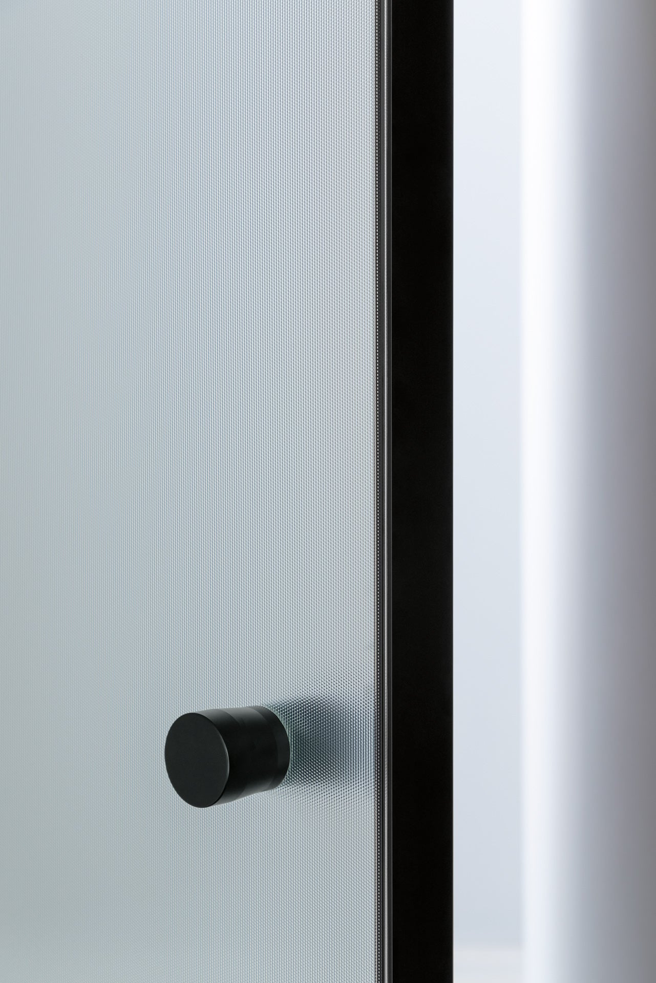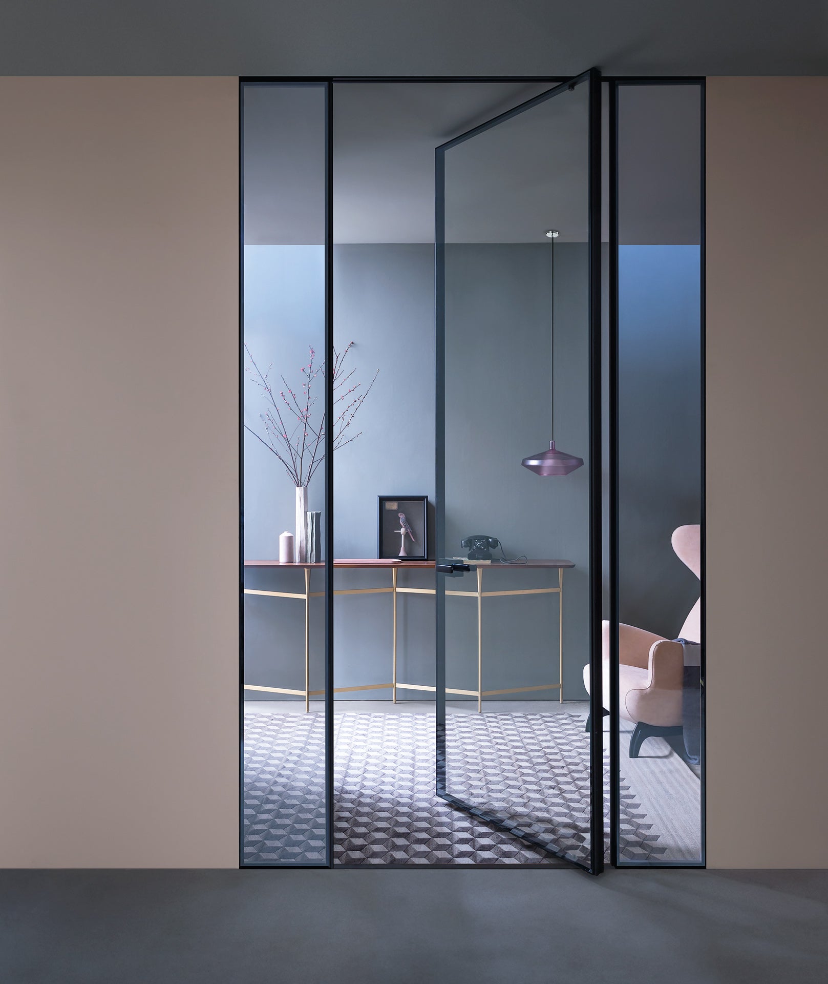 Shoin Pivot is a pivot glass door with an aluminum frame and a minimalistic design.