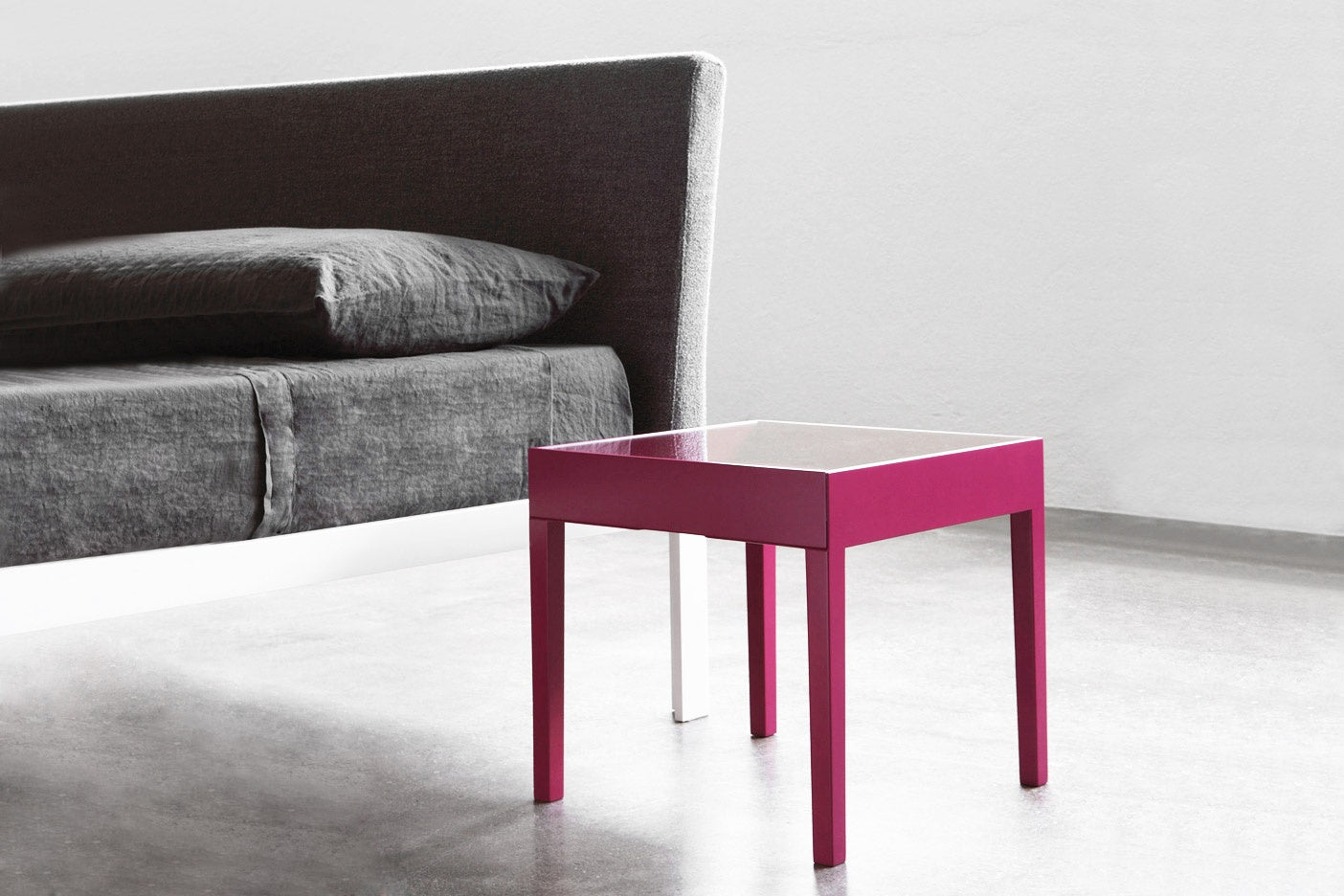 The table-bedside table Showcase Table, with slender lines, presents a double top where to store under the glass daily life objects, a book, spectacles, a fruit, exhibited as in a showcase but turned into real masterpieces.