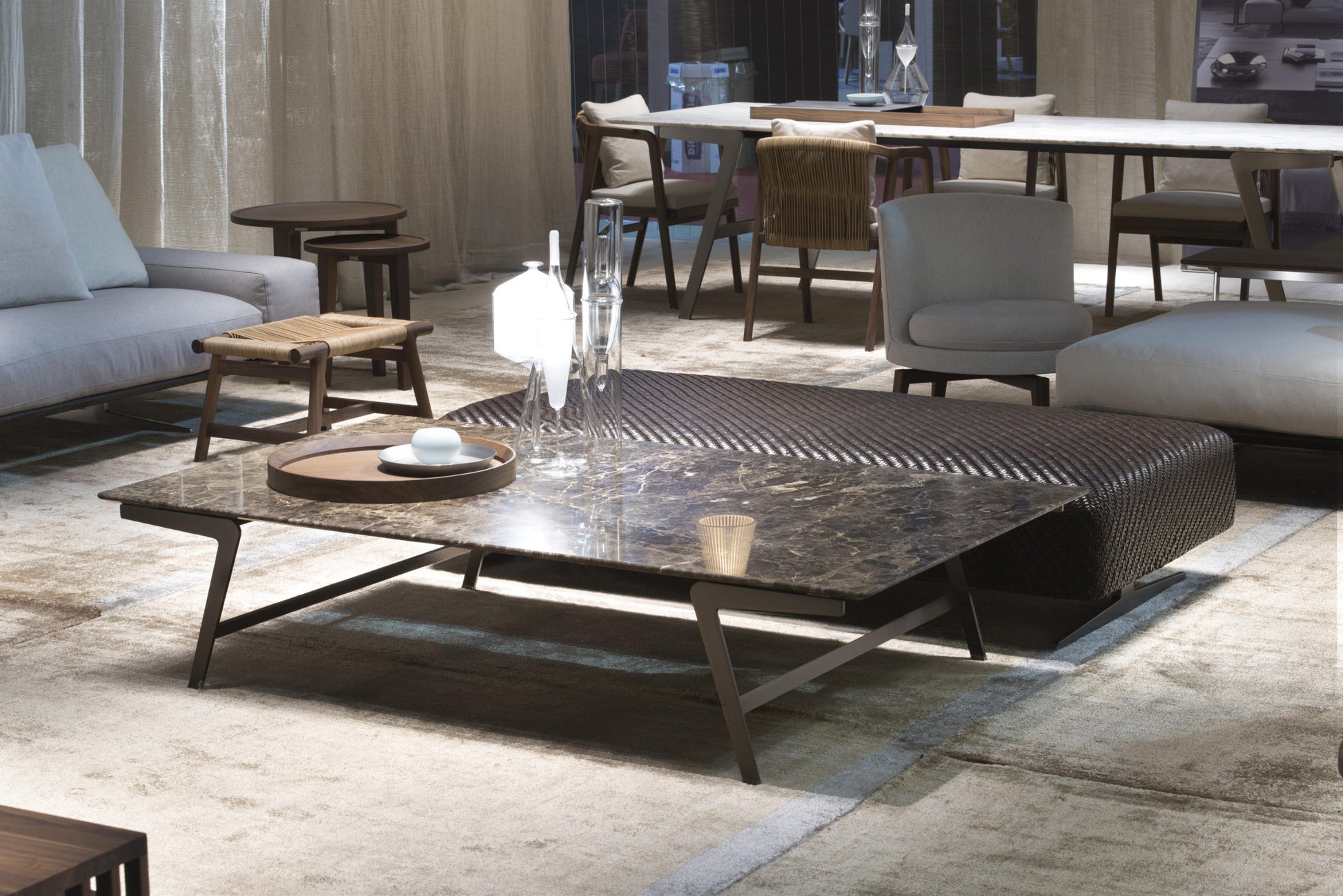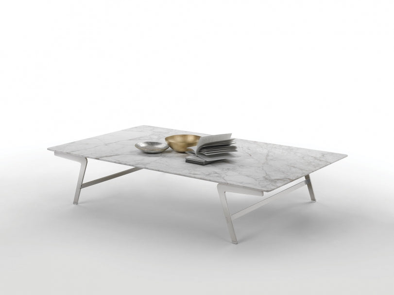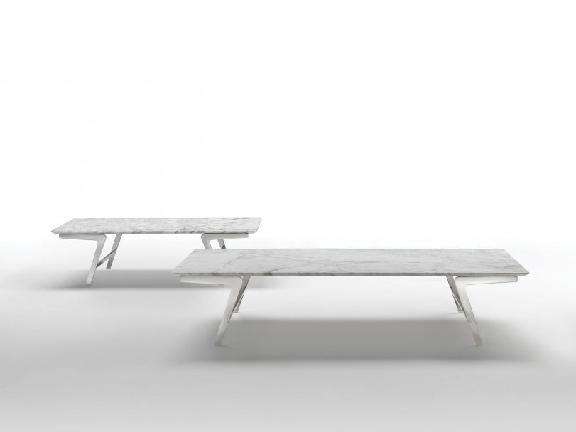 From a formal standpoint this is an extremely architectonic table. The flat metal leg is the distinctive design feature. With its particular “boomerang” form it generates an image that makes a clean break with the usual orthogonal arrangement of top and structure, inserting a forceful feature that generates identity, an almost airborne sense of poise, even with large measurements. SOFFIO has a metal base and a top in solid wood or marble. Solid and light at the same time, it plays with the clean form of the structure that supports the overhanging top. Originally rectangular in form, even in the length of 3 meters it conveys an idea of aesthetic lightness, thanks to the slender legs and top. SOFFIO generates a family of products, also including smaller tables and consoles.