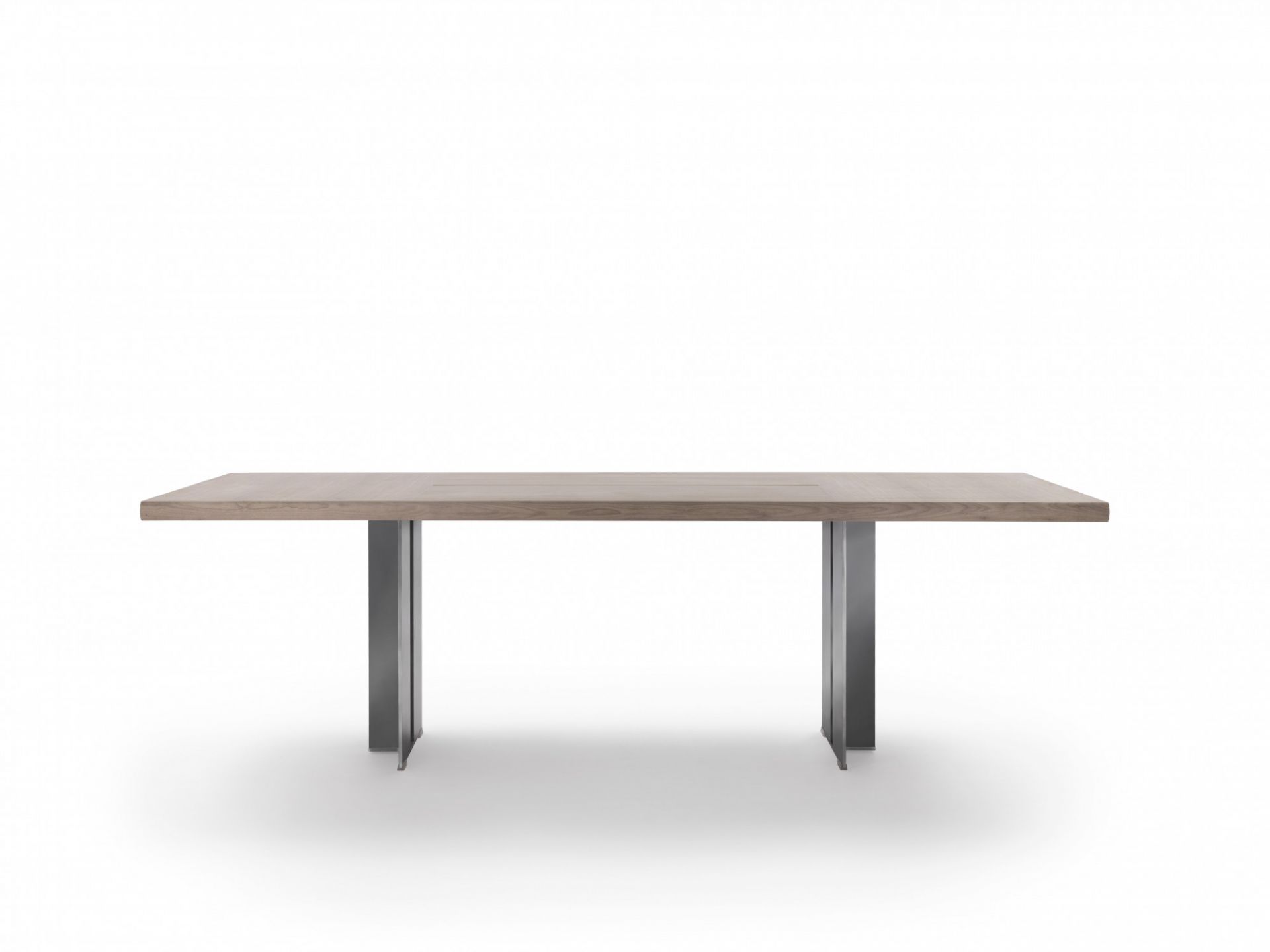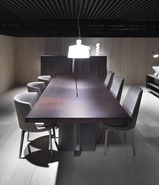The Spello table – two sculptural bases in painted metal – spells unmistakable personality. The source of inspiration is brutalism, an architectural and artistic movement known for its rugged, raw shapes and robust structures. Contrasting the severity of the support base is the poetic texture of the solid wood top, played up by the design of the boards that echo the noble tradition of inlay work and by a subtle opening that runs the length of the top. Available only in rectangular version, the Spello table comes veneered in Canaletto walnut, ash or ebony, in a choice of stains. It is also available in a version with an array of marble top choices.