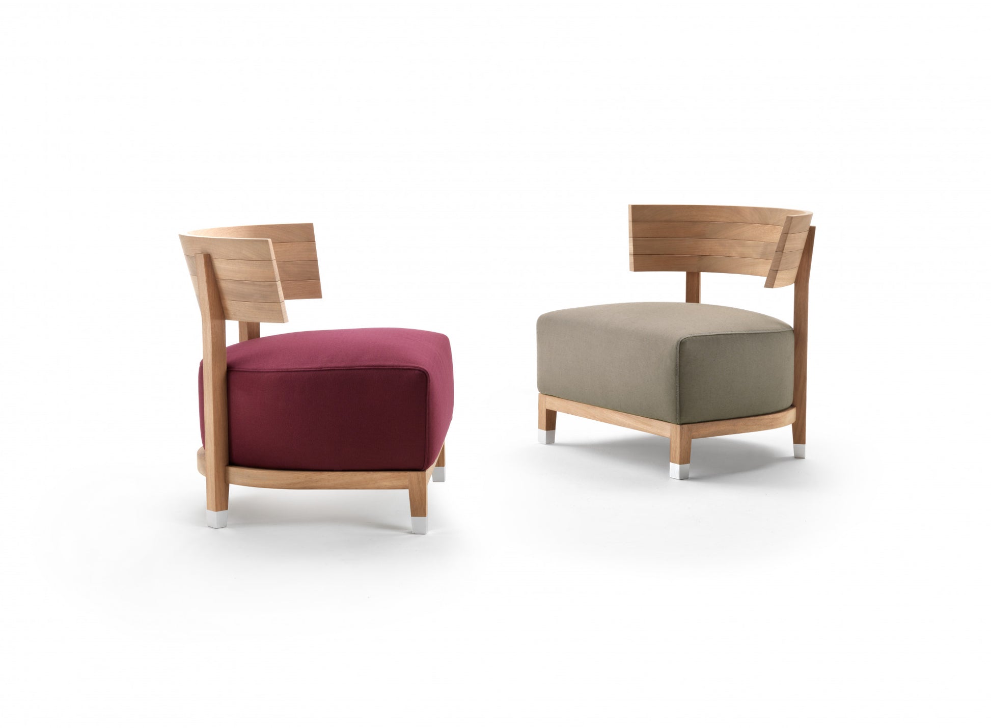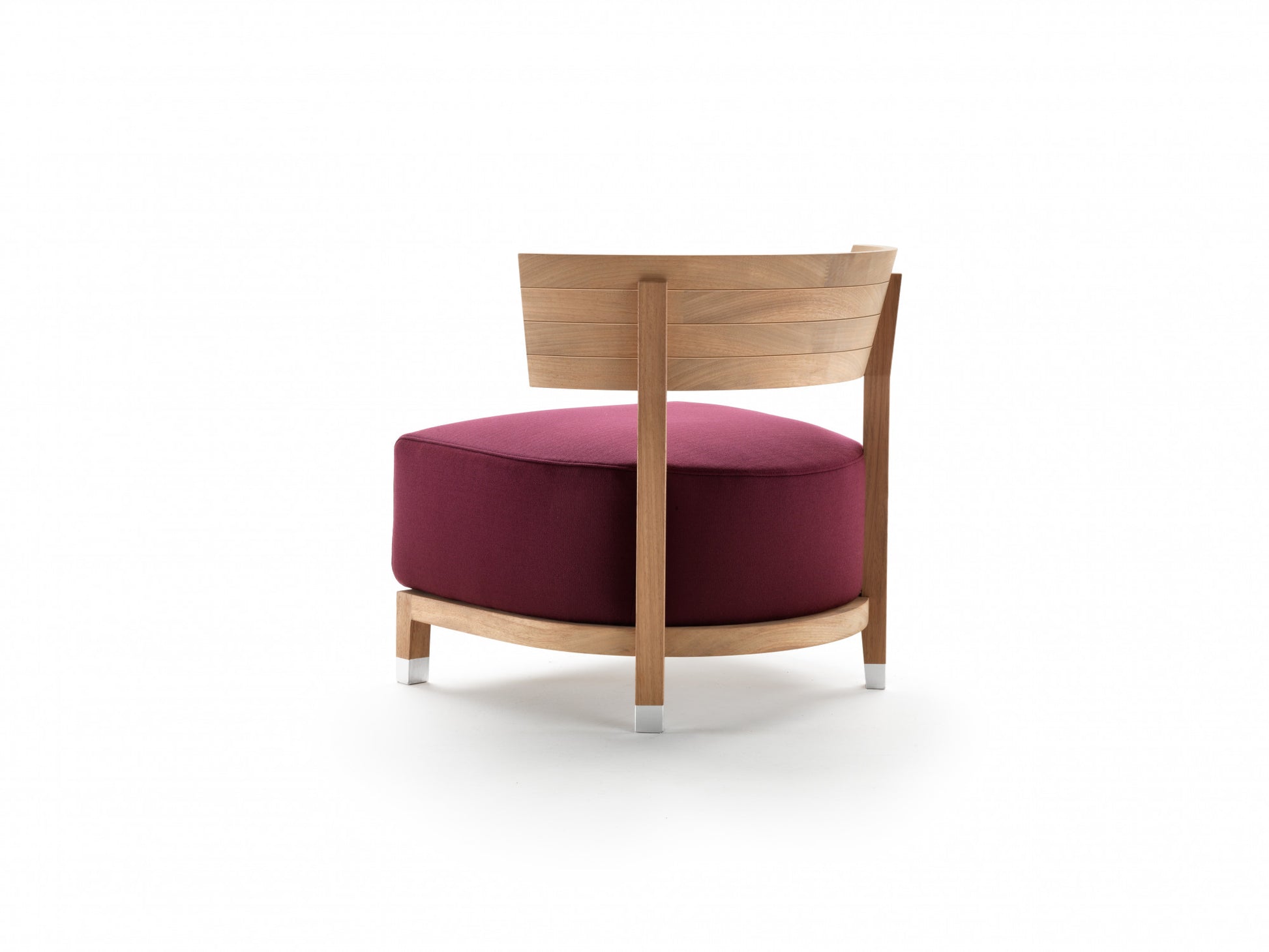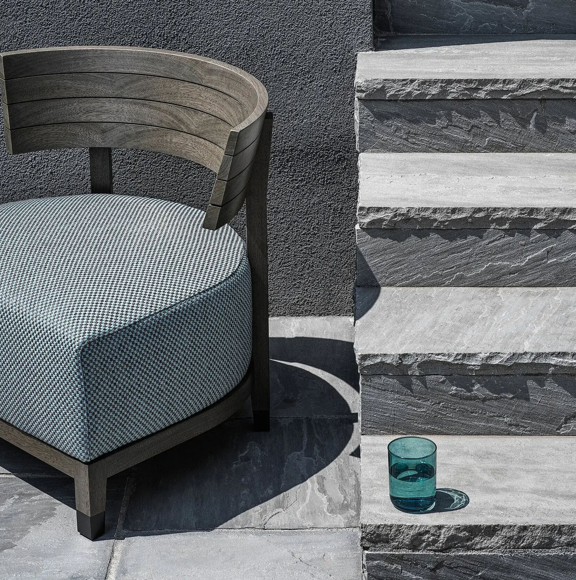 The Thomas armchair, undisputed best-seller from the indoor collection – thanks to its inherent elegance and incredible versatility – is now being brought back in an outdoor version. The seat cushion is padded in polyurethane foam covered with a protective, breathable, waterproof laminated fabric and rests on an elegant iroko wood base, while the feet feature die-cast metal alloy tips and nylon pads.