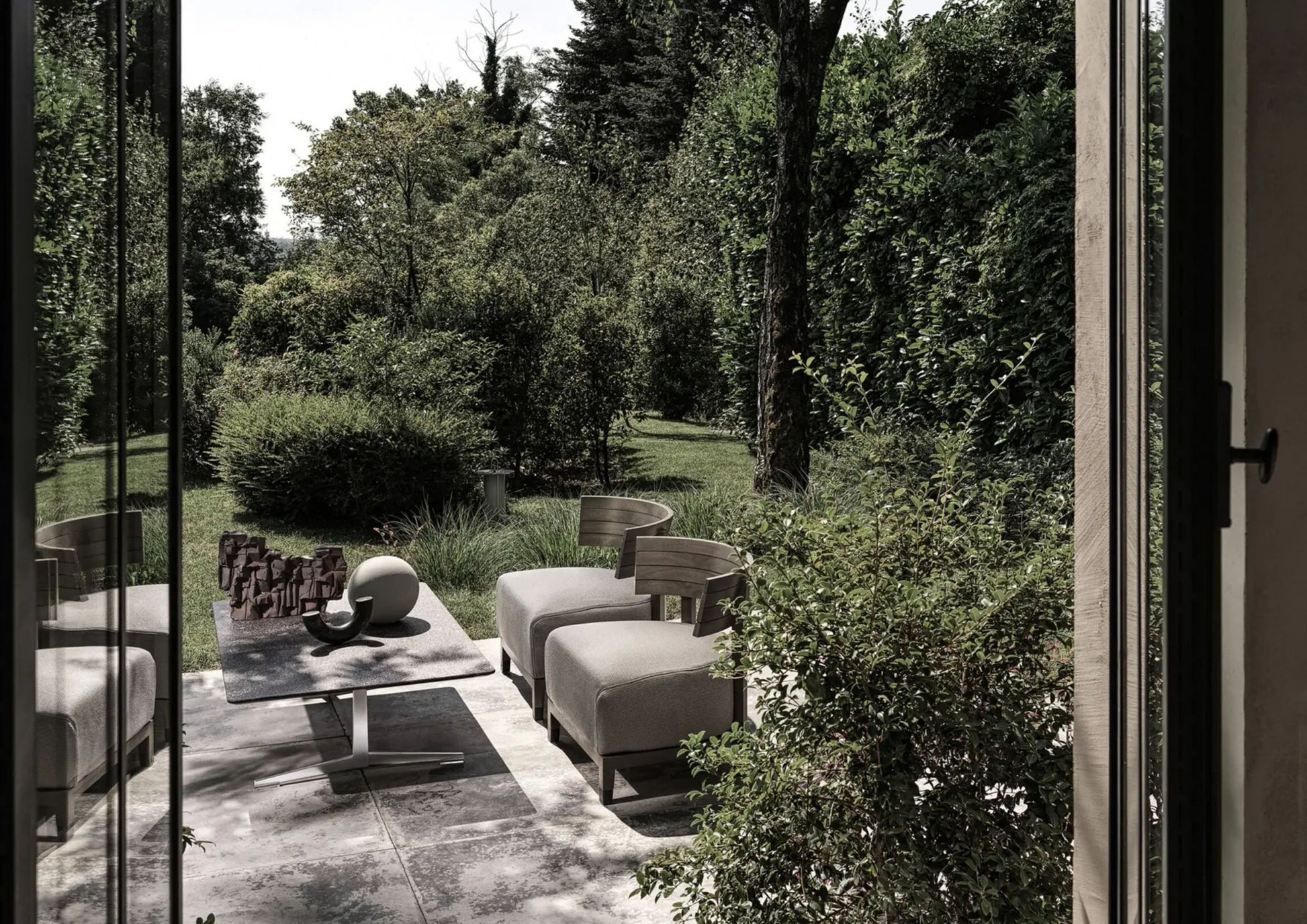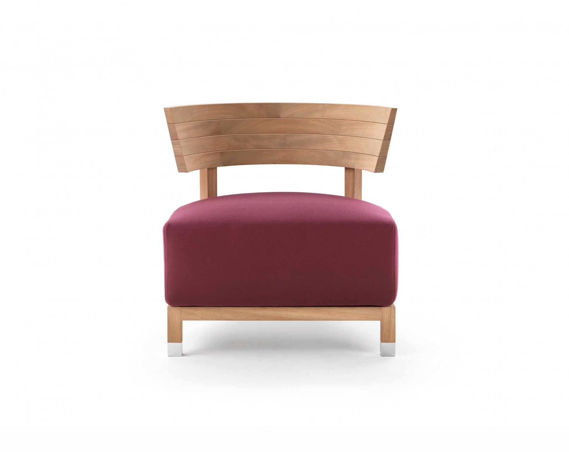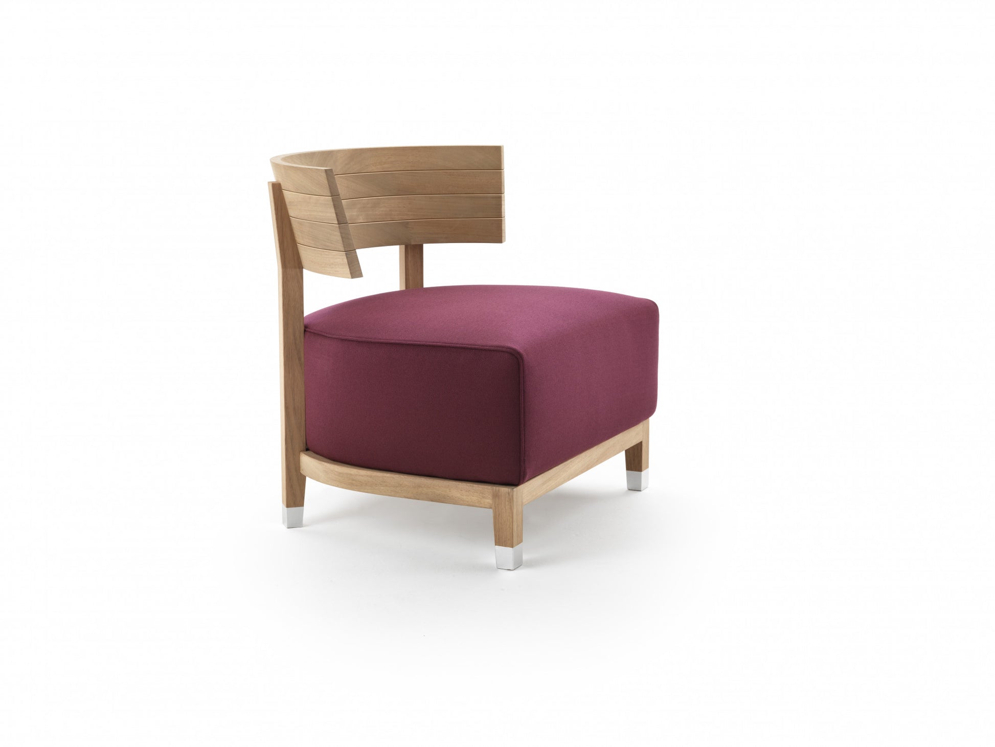 The Thomas armchair, undisputed best-seller from the indoor collection – thanks to its inherent elegance and incredible versatility – is now being brought back in an outdoor version. The seat cushion is padded in polyurethane foam covered with a protective, breathable, waterproof laminated fabric and rests on an elegant iroko wood base, while the feet feature die-cast metal alloy tips and nylon pads.