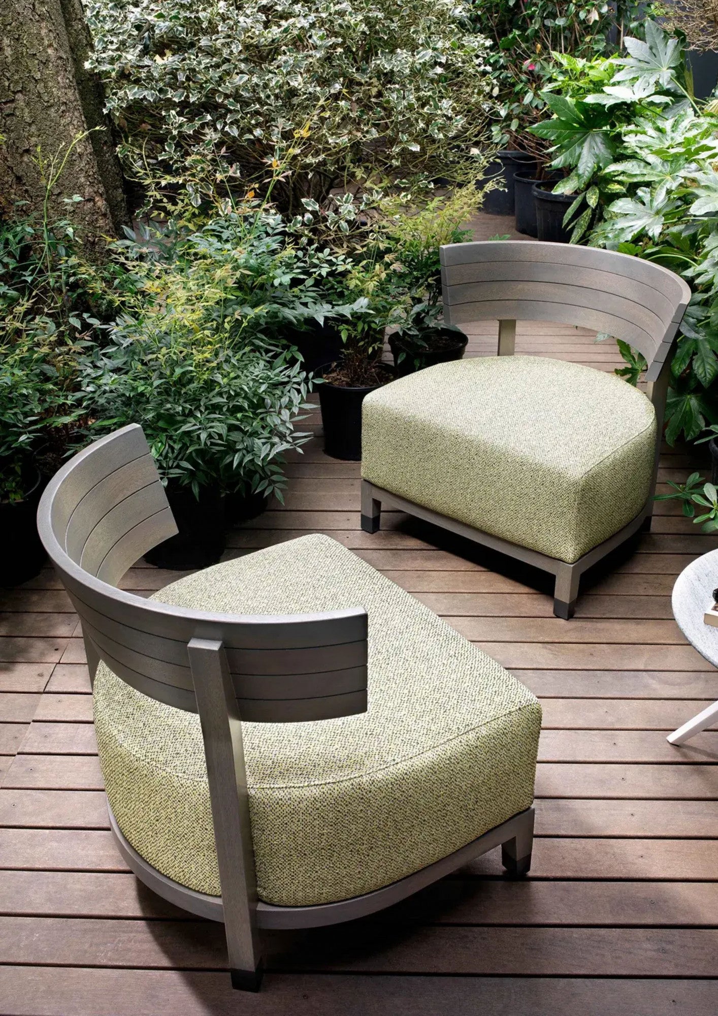 Both the structure of the Thomas Outdoor armchair and its streamlined yet functional semi-circular backrest are made of prized solid iroko, with natural finish, stained grey or lacquered white finish. With its graceful lines and compact proportions, the Thomas Outdoor armchair is a veritable all-around piece that can play a starring role on a porch or patio, or be matched with the new outdoor seating systems to contribute to the allure of dynamic, personalized outdoor settings.