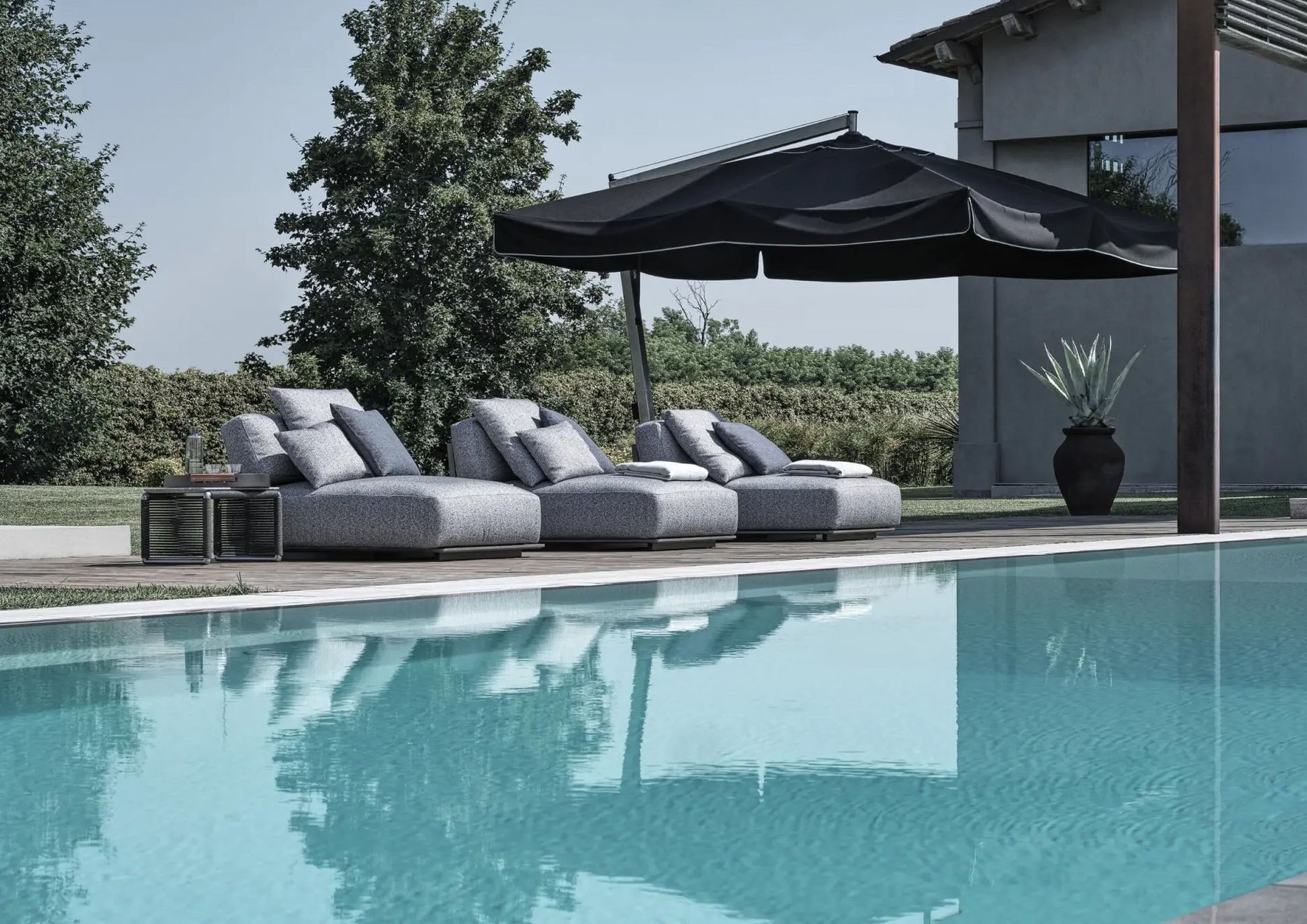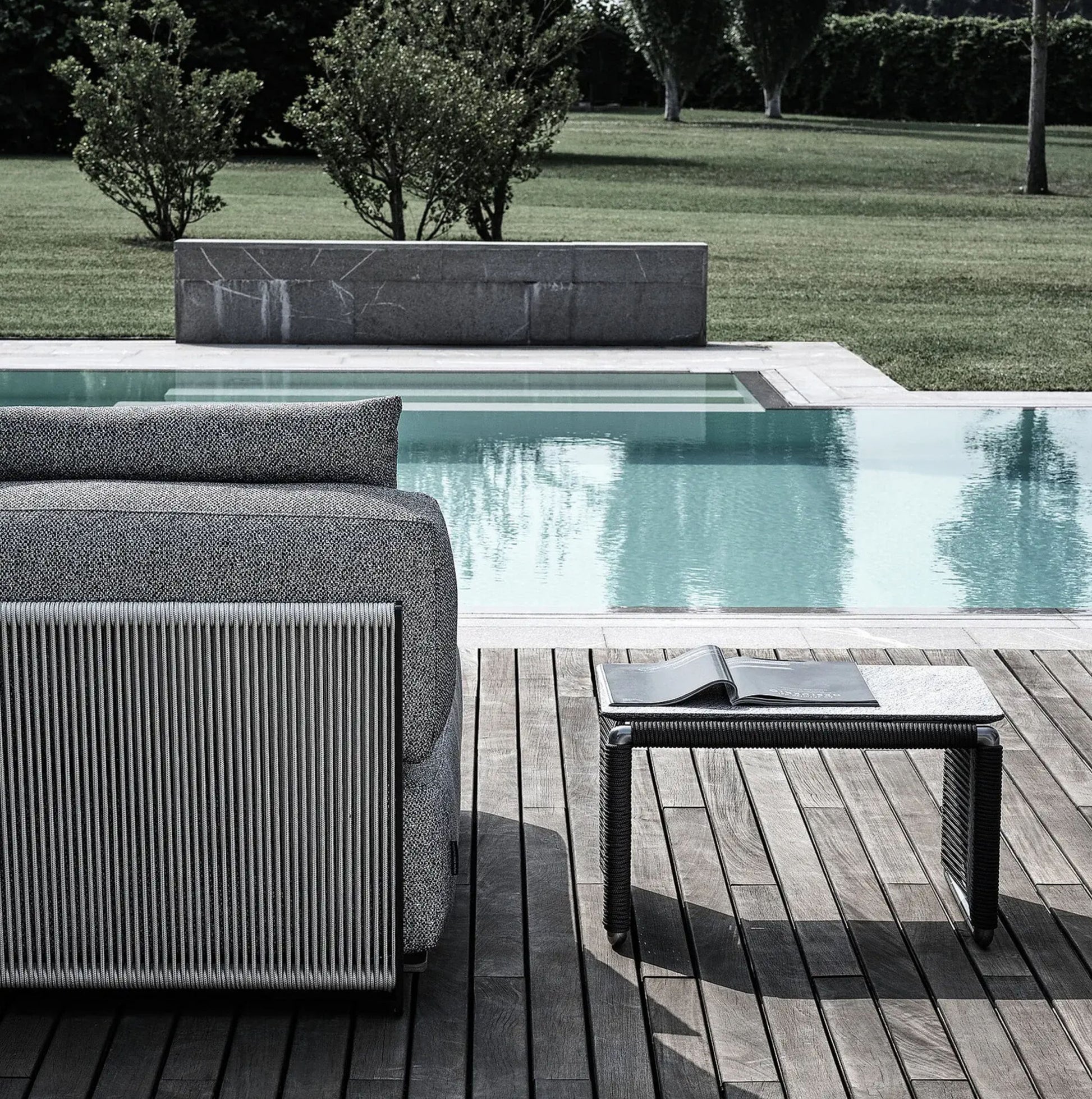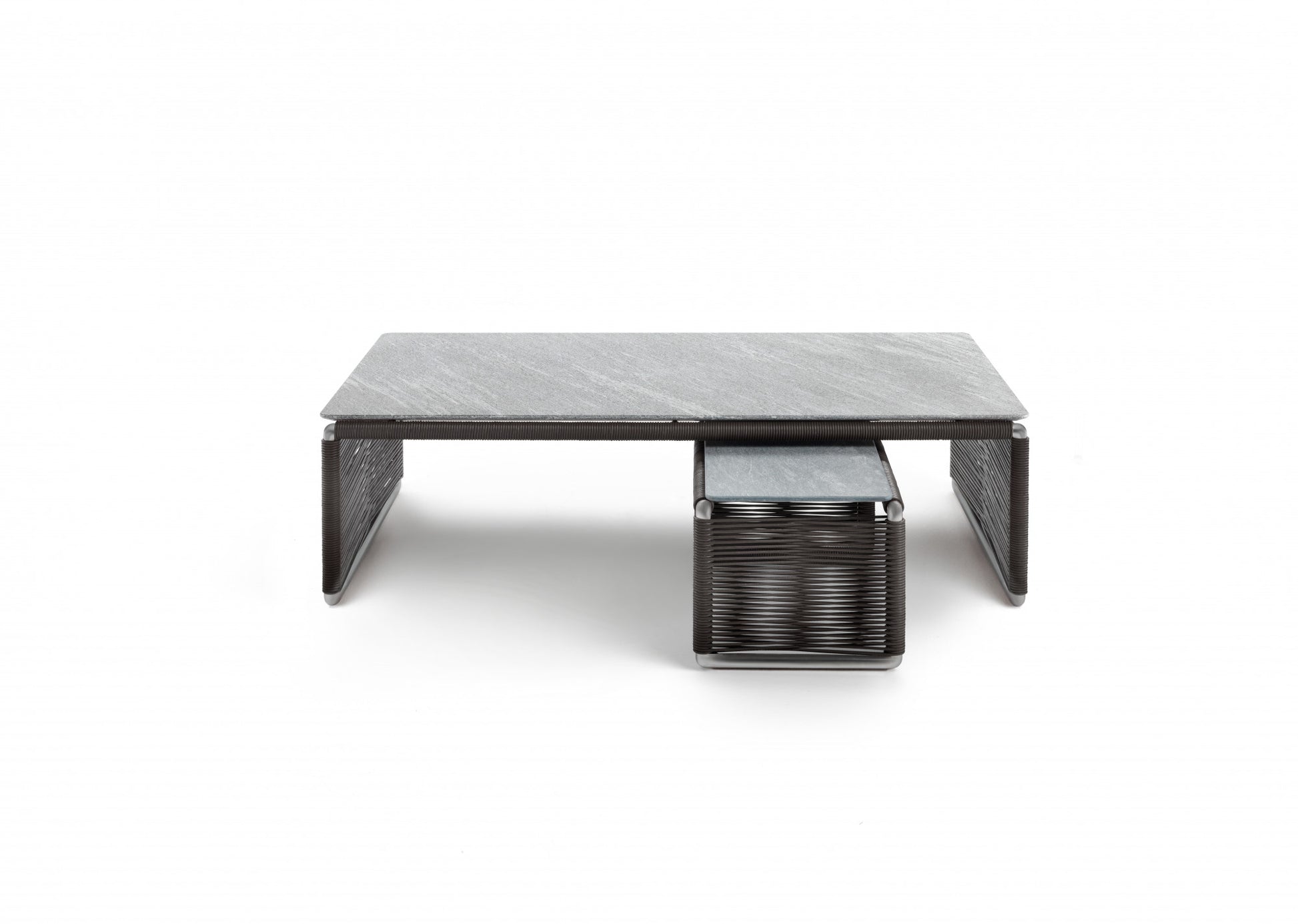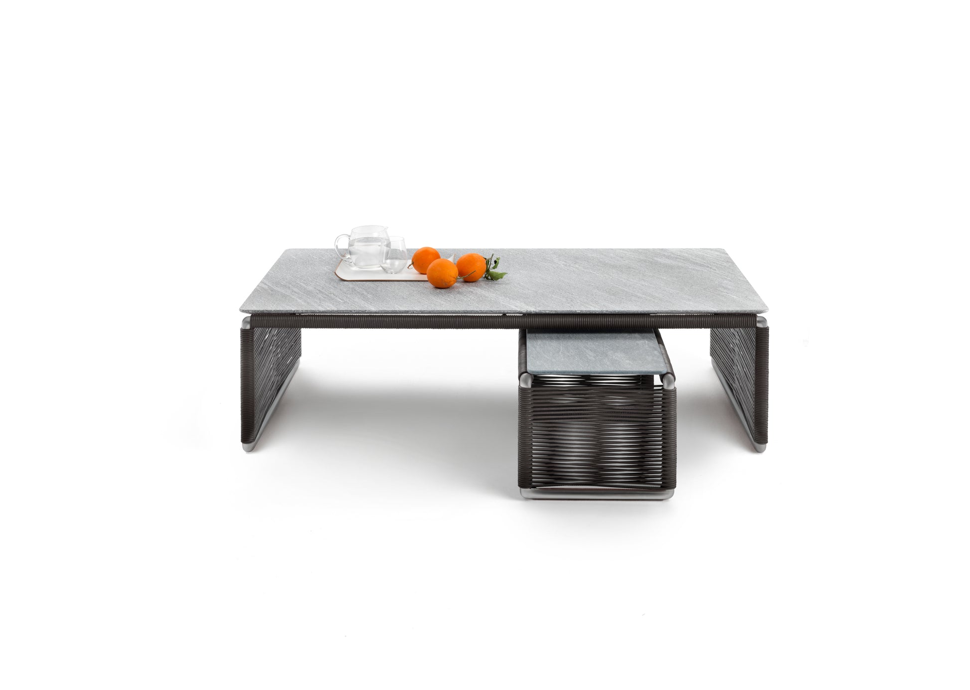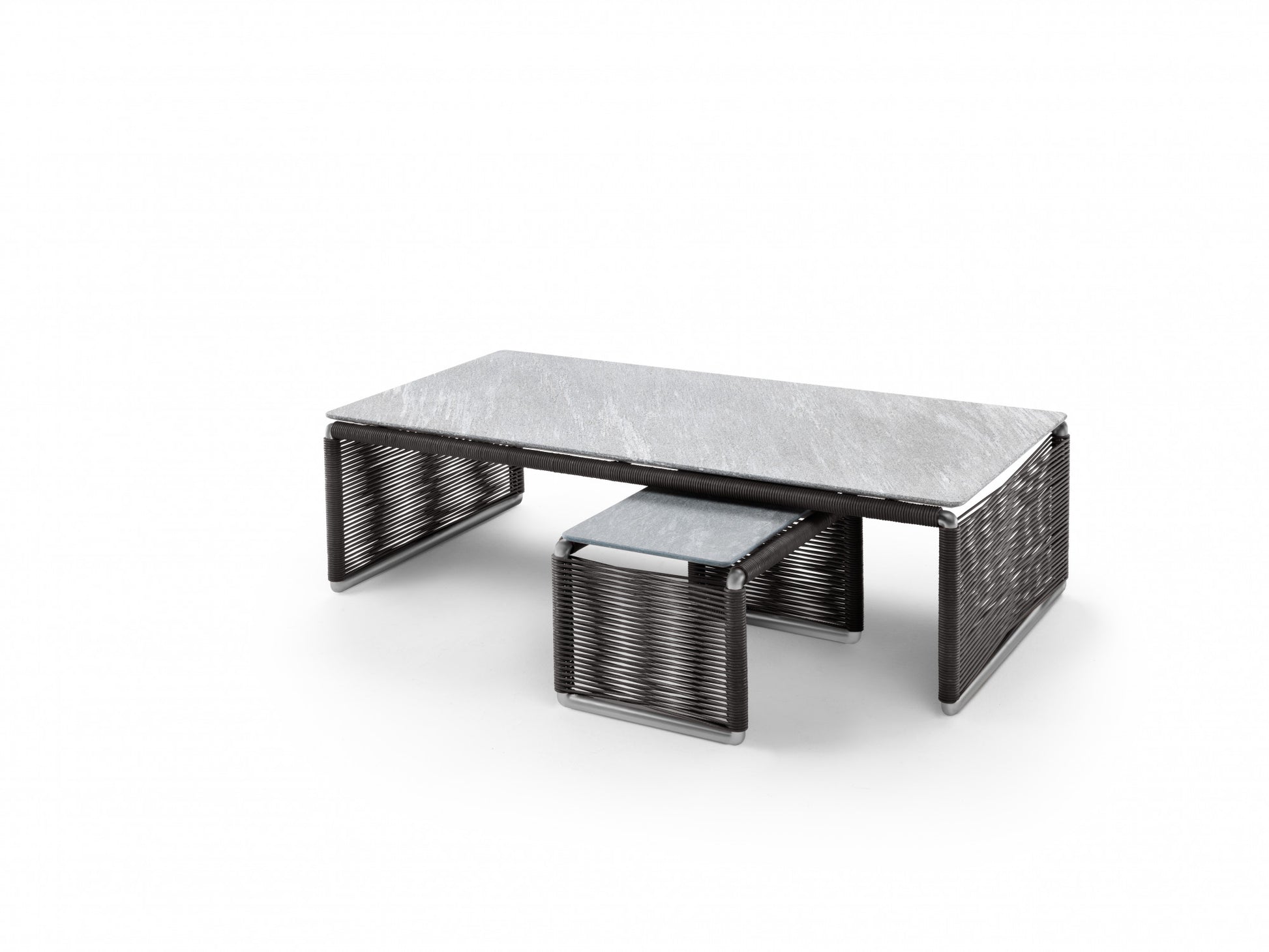 The Tindari Outdoor coffee tables impeccably interpret a theme dear to Flexform, that of the woven design. The structure of the coffee tables is in extruded aluminum with epoxy powder-coated finish in white, khaki green, wine red; or burnished or satin-finish aluminum. The structure is entirely enveloped in sophisticated woven polypropylene fiber or woven polyurethane rubber, in a color palette that ranges from earth tones to bordeaux and olive green. Hand-woven by expert artisans, the upholstery lends welcoming warmth to the metal, making Tindari an object with unmistakable personality that can easily be combined with any of the chairs in the Flexform outdoor collection to furnish porches, decks and patios with style and elegance. Tindari coffee tables also come in a version with the top in Beola argentata (slivery green gneiss), lava stone, porphyry or pietra del Cardoso.