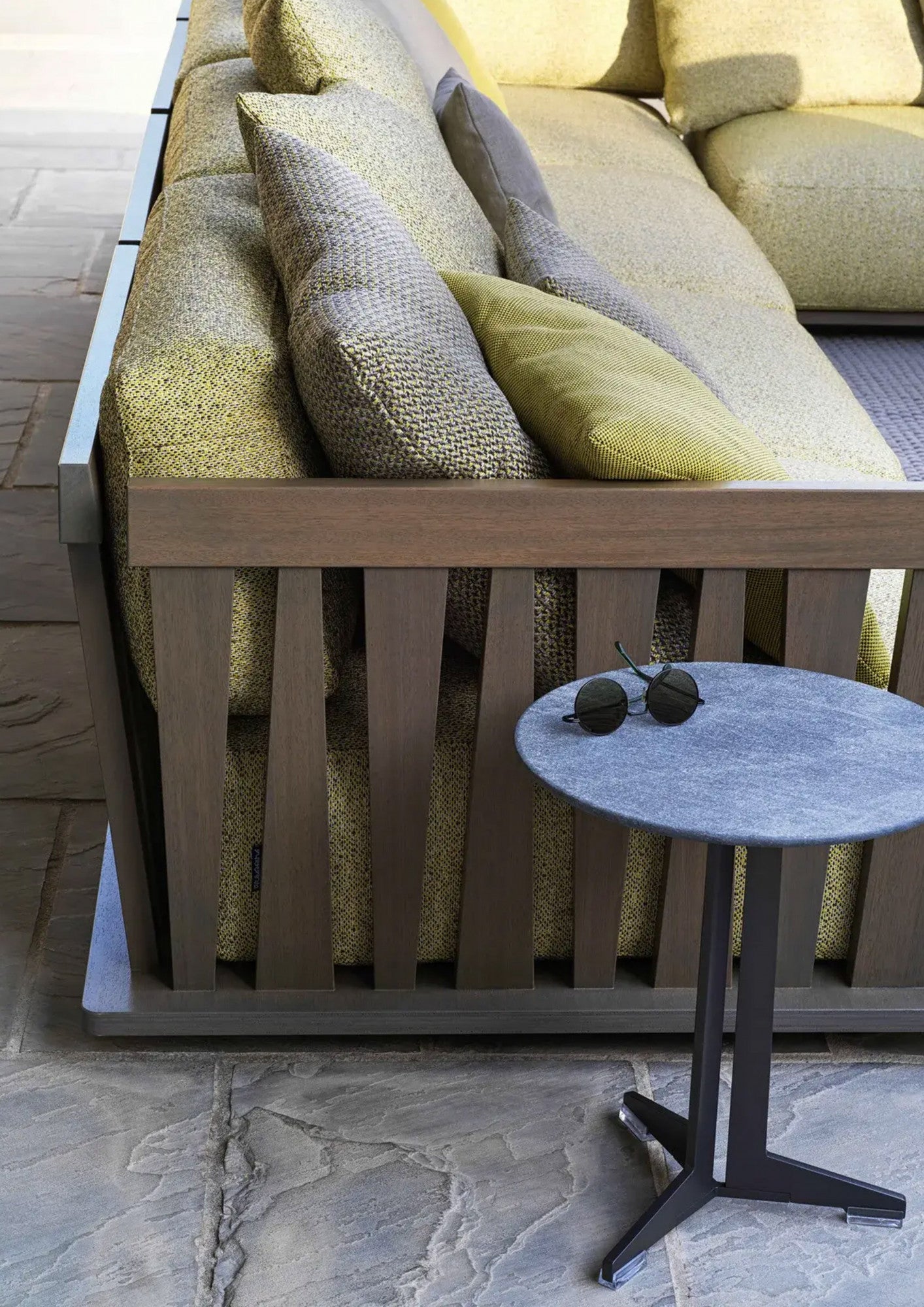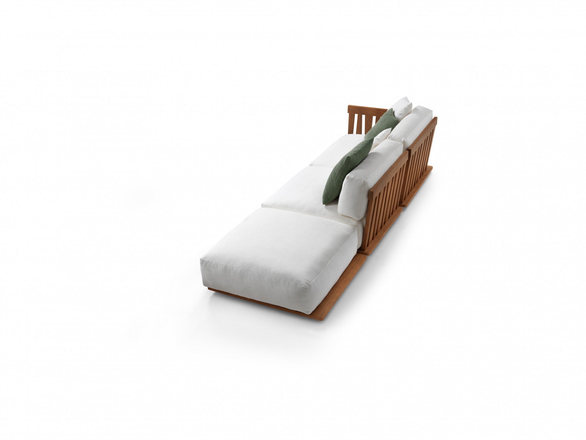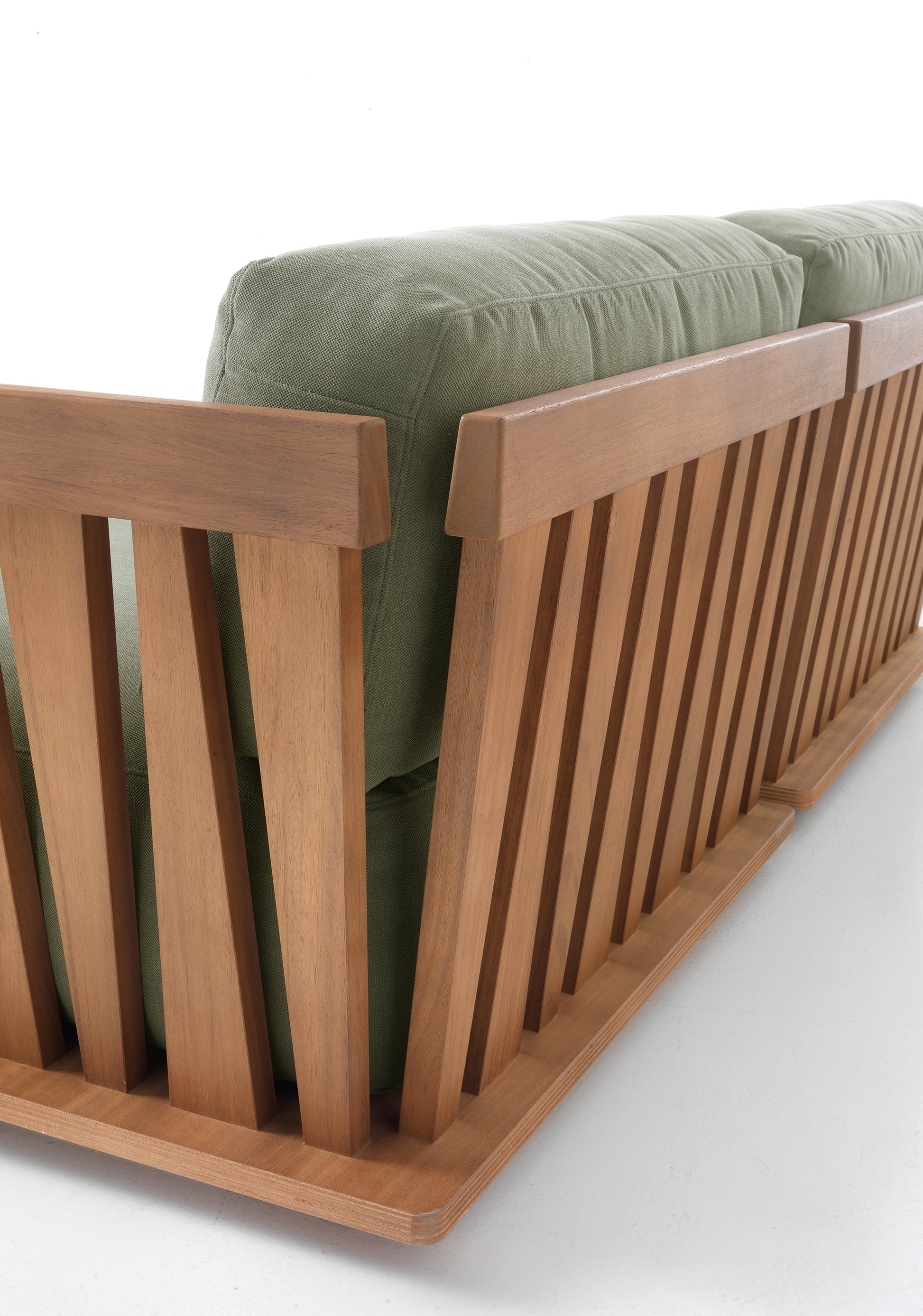 The base of the Zante sofa is made entirely of Okoume marine plywood, perforated to allow better aeration of the cushions. The upper part is in iroko veneer, to match the structure of the backrest and armrests, which are made entirely of solid iroko, with a unique design of hand-fitted interlocking strips of irregularly shaped wood. The sofa sits on a perimeter frame in austenitic stainless steel 316 which is lifted off the floor by nylon pads.